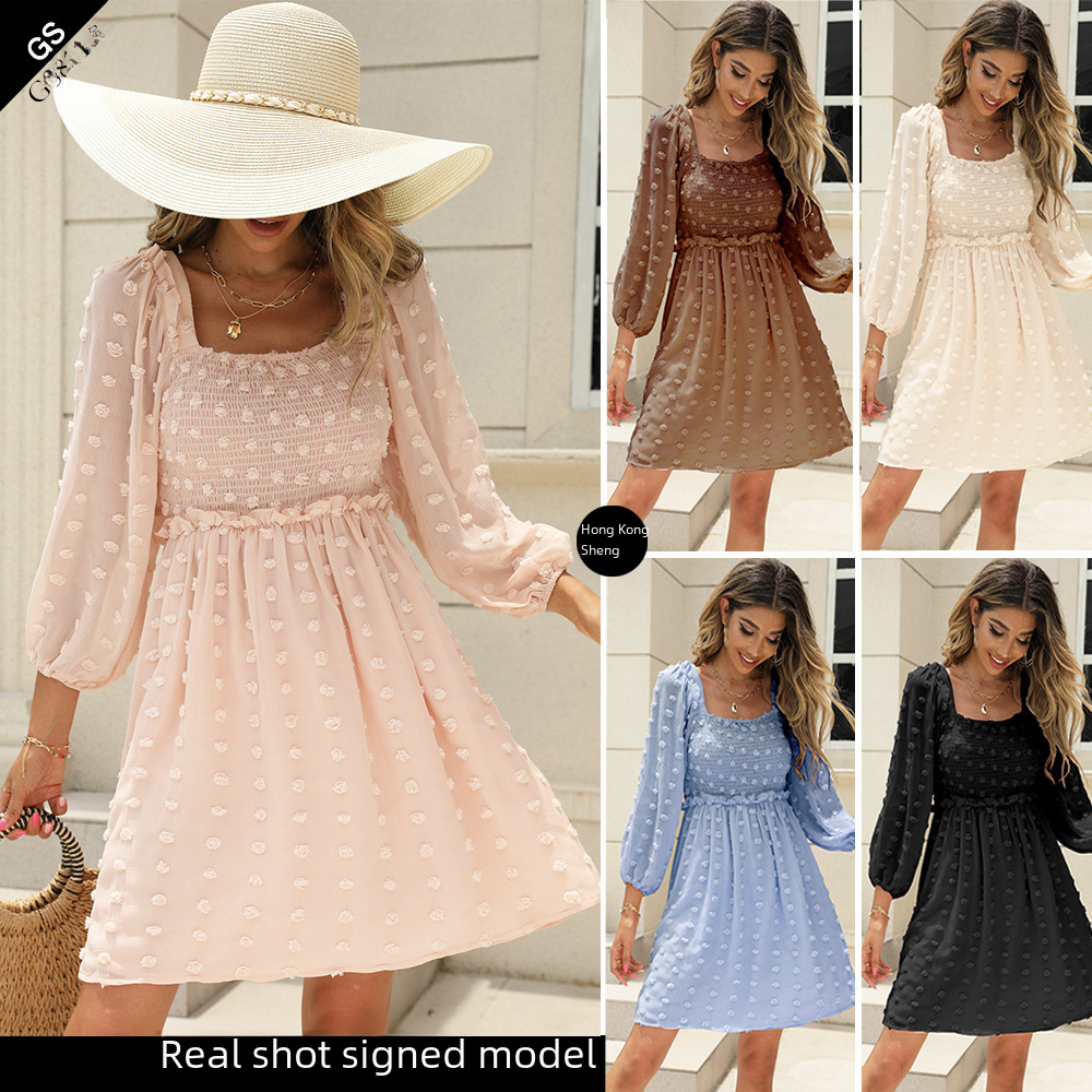| nameOriginal | 2022 Europe and the United States cross-border new Amazon square collar chiffon Wave skirt fashion lantern sleeve women dress |