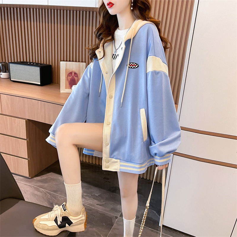| nameOriginal | 2022 new spring and autumn hooded sweater women's lazy style design stitching contrast color cardigan baseball uniform coat women |