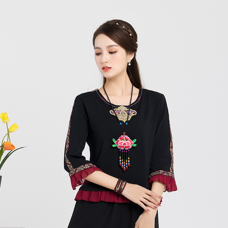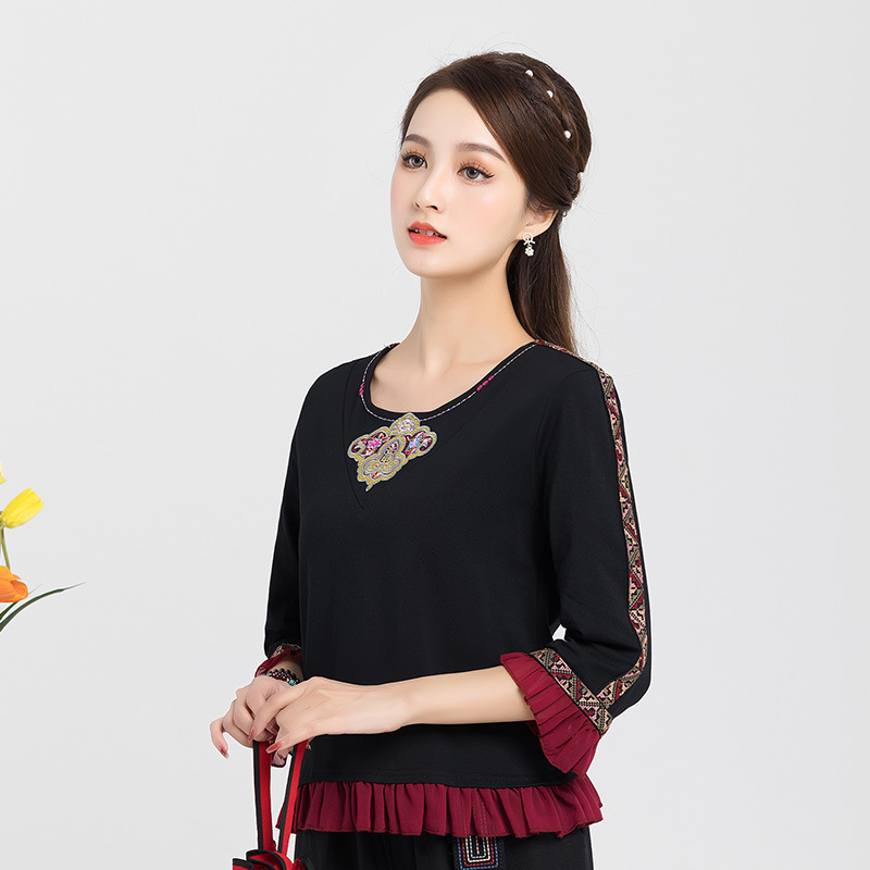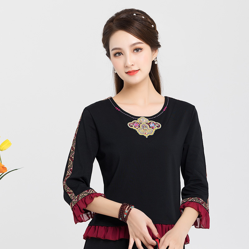 | nameOriginal | 2022 real shot new ethnic style round neck 3/4 sleeve heavy industry patch embroidered stitching plus size top for women |