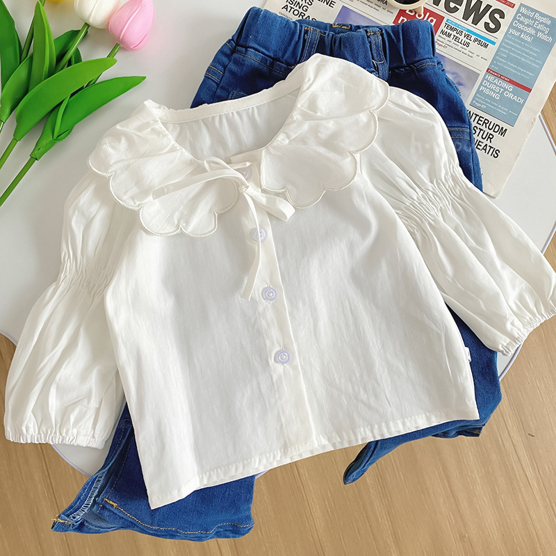 2022 Spring and Autumn New Women’s Cute Small Lapel Top Girls’ Autumn Girls’ Belted Sleeve Cotton Shirt 0029