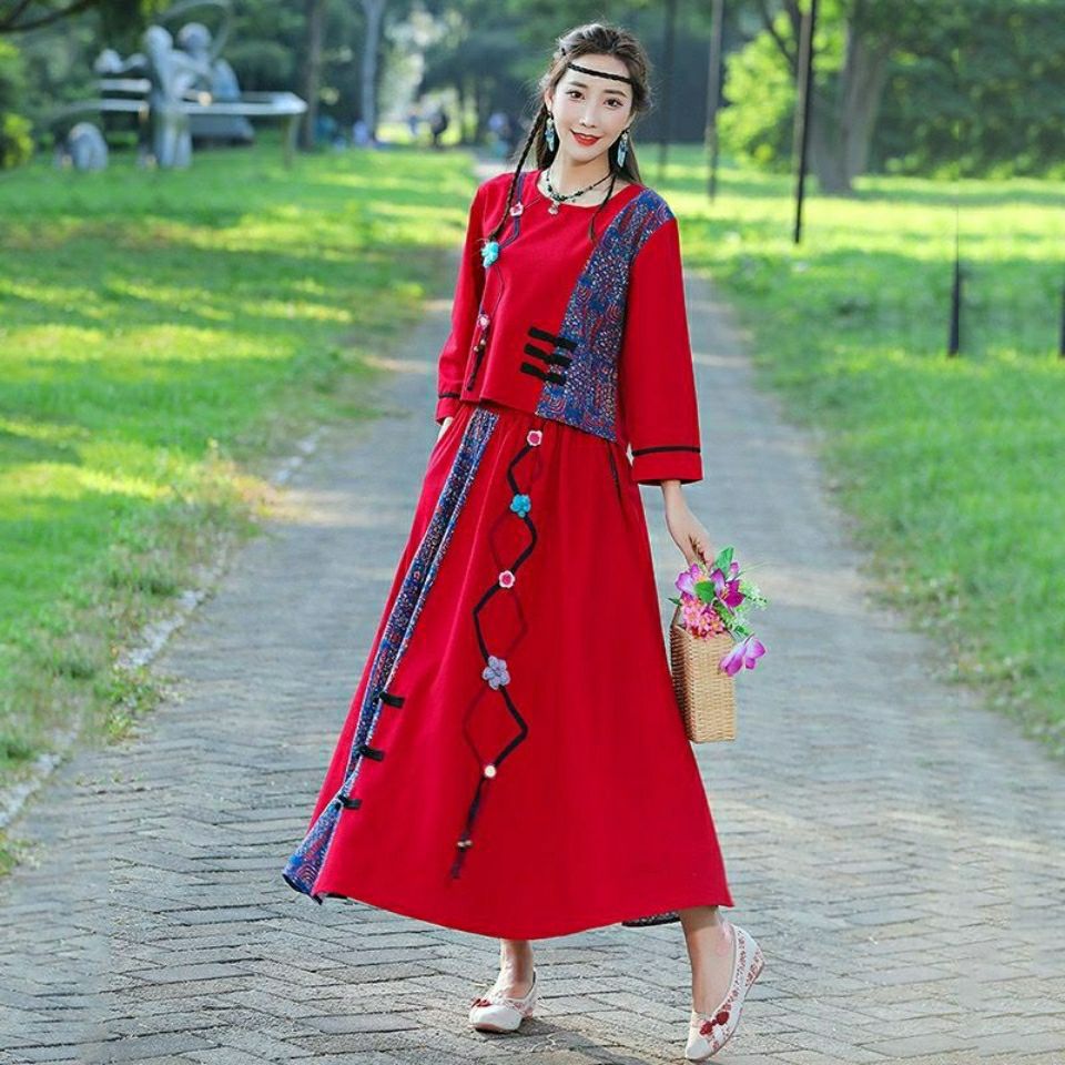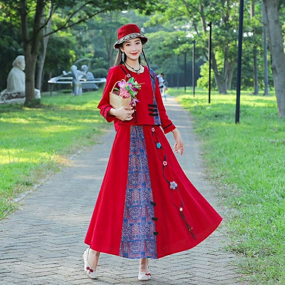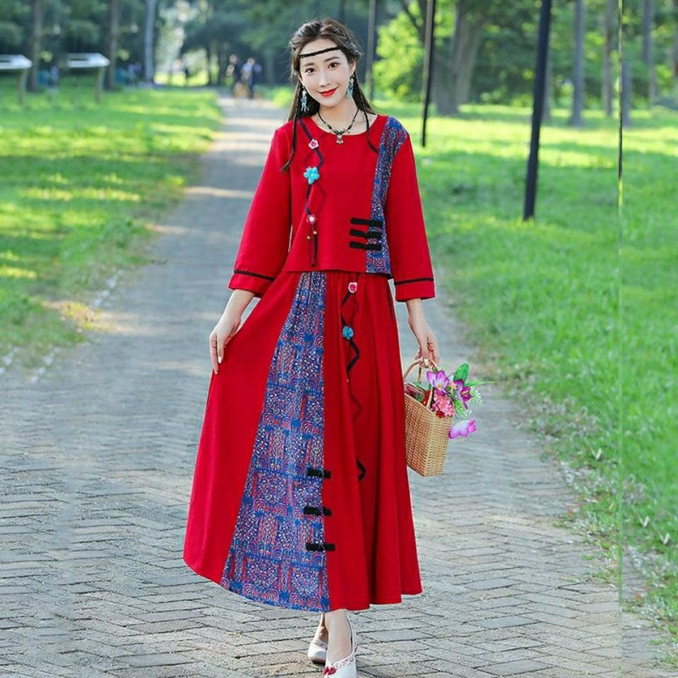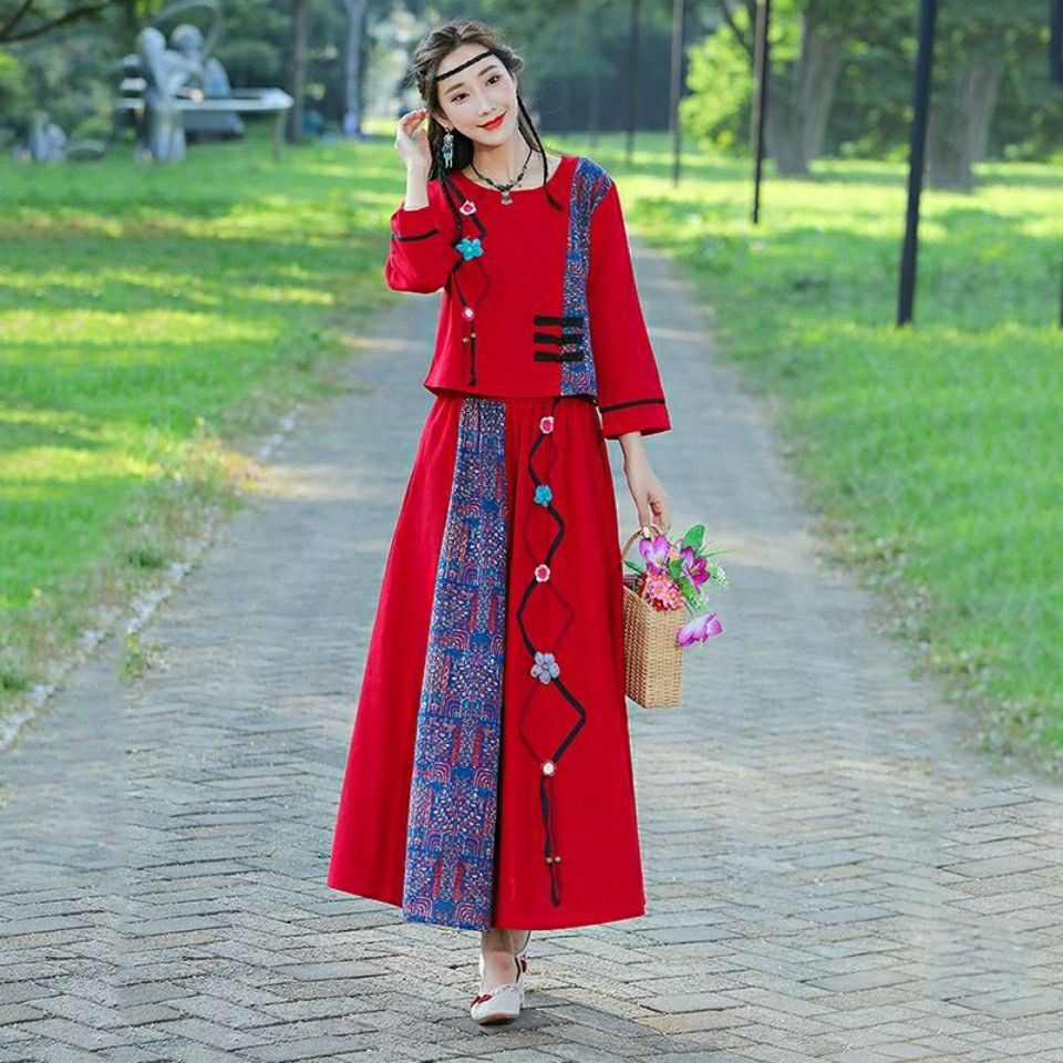 | nameOriginal | 2022 Spring Summer Autumn New Travel Cotton and Linen Two-piece Ethnic Style Women's T-shirt Top + Ribbon Skirt Set |