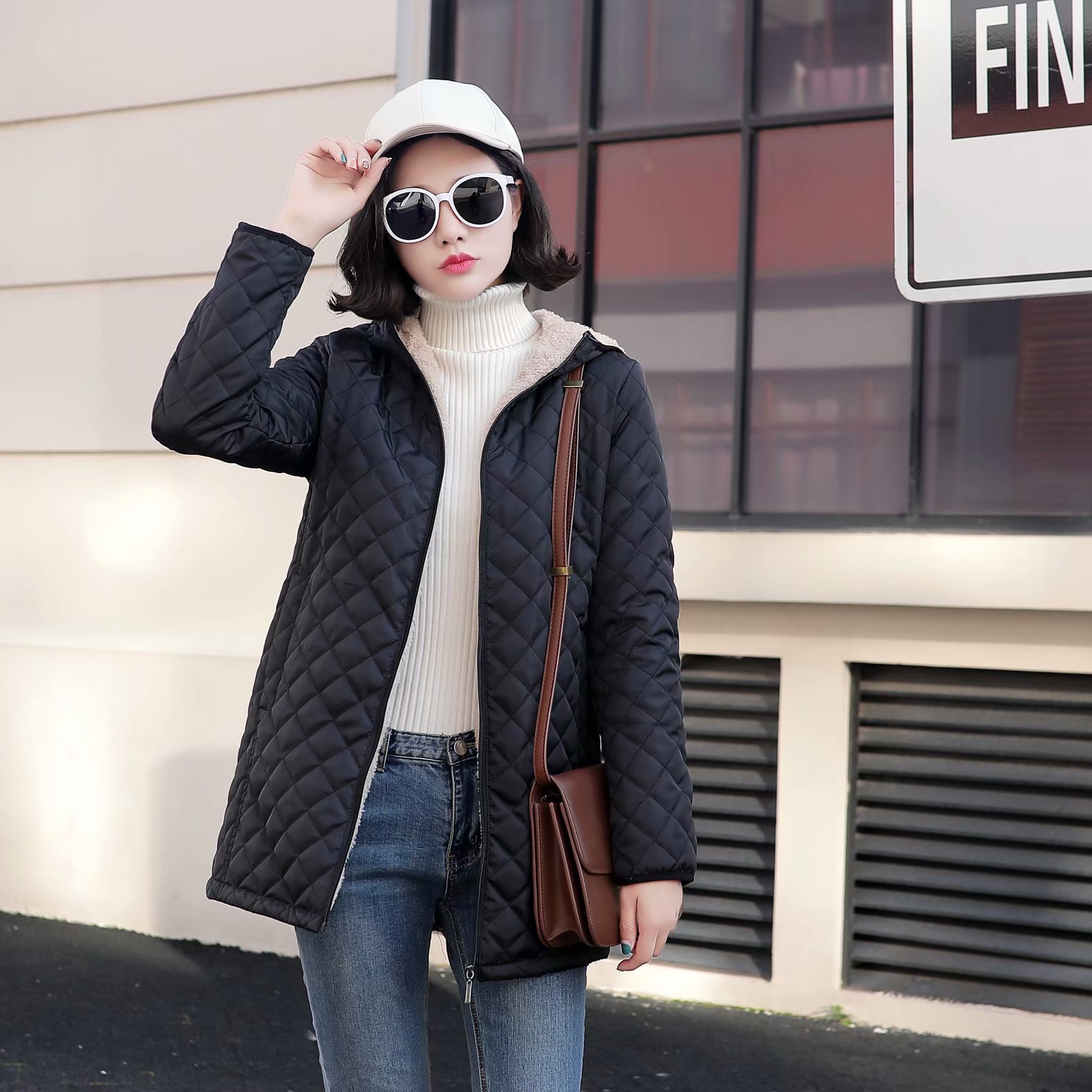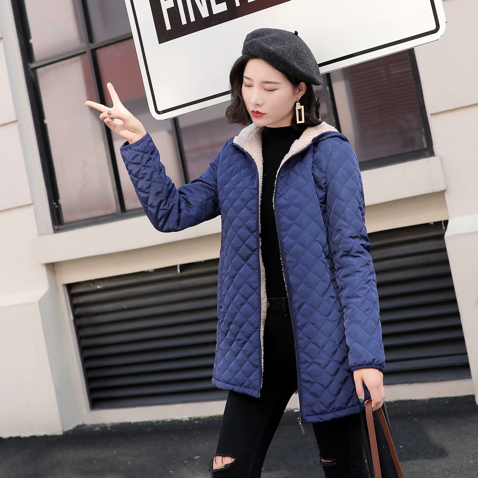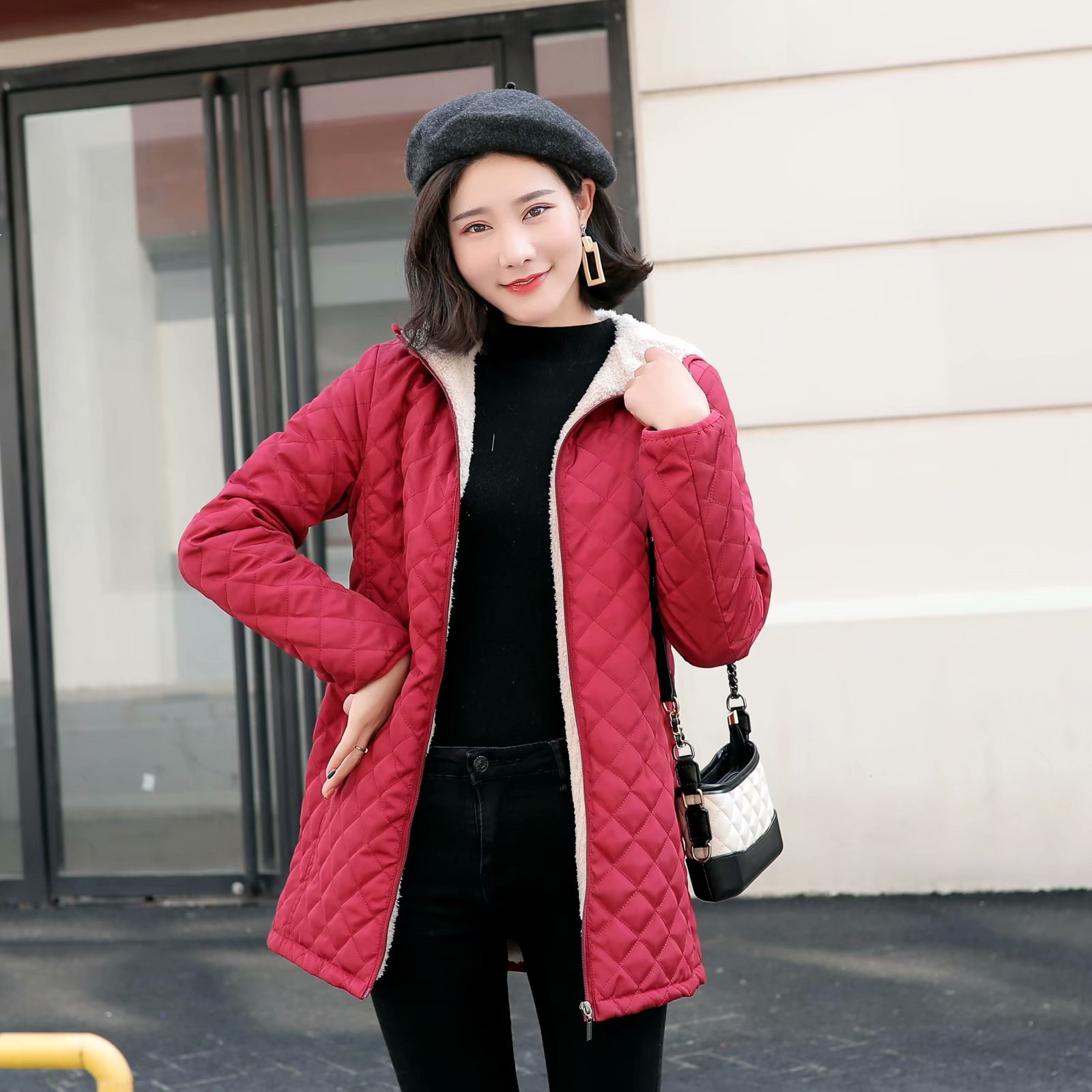 2022 Winter New Hooded Warm Lamb Fleece Long-sleeved Cotton-padded Coat Plus Size Cotton-padded Jacket Women's Mid-length Plaid Coat