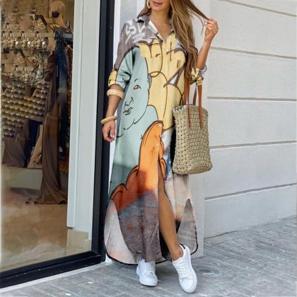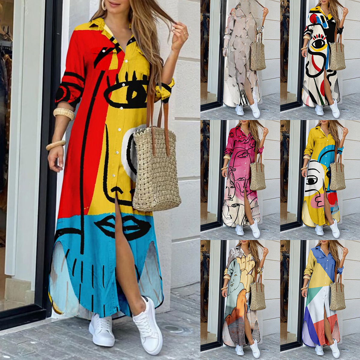 2022eBay AliExpress new fashion long sleeve printed shirt dress long dress (positioning flower)