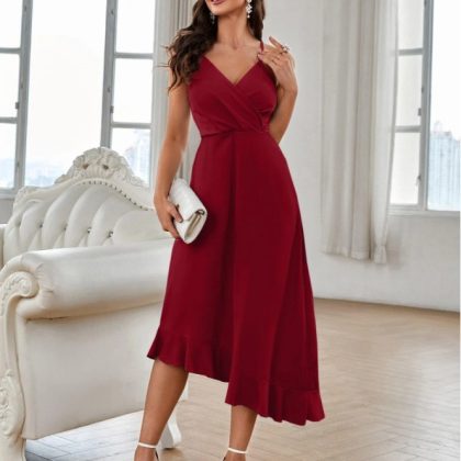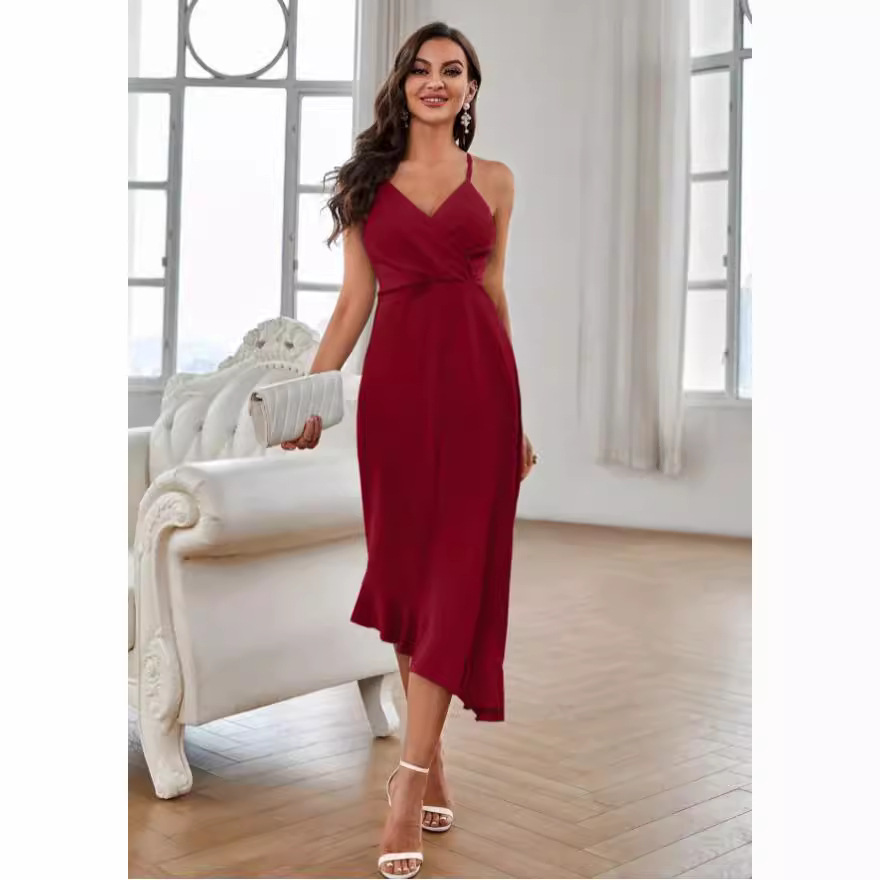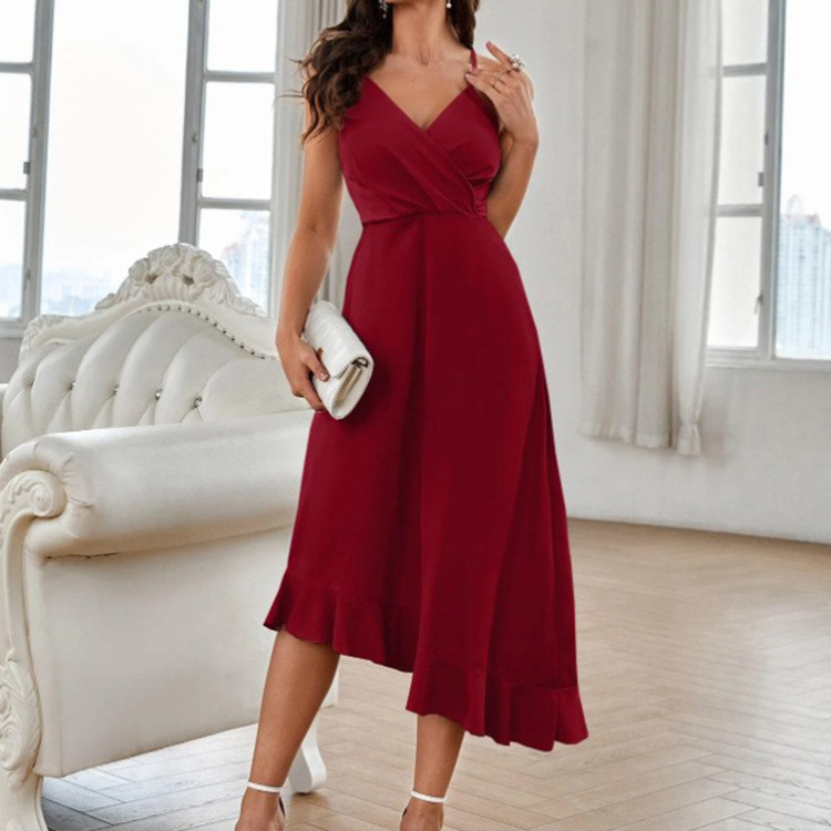 2023 AliExpress Amazon Cross-border Foreign Trade Summer Women’s Sling Sexy Backless Ruffled Solid Color Dress
