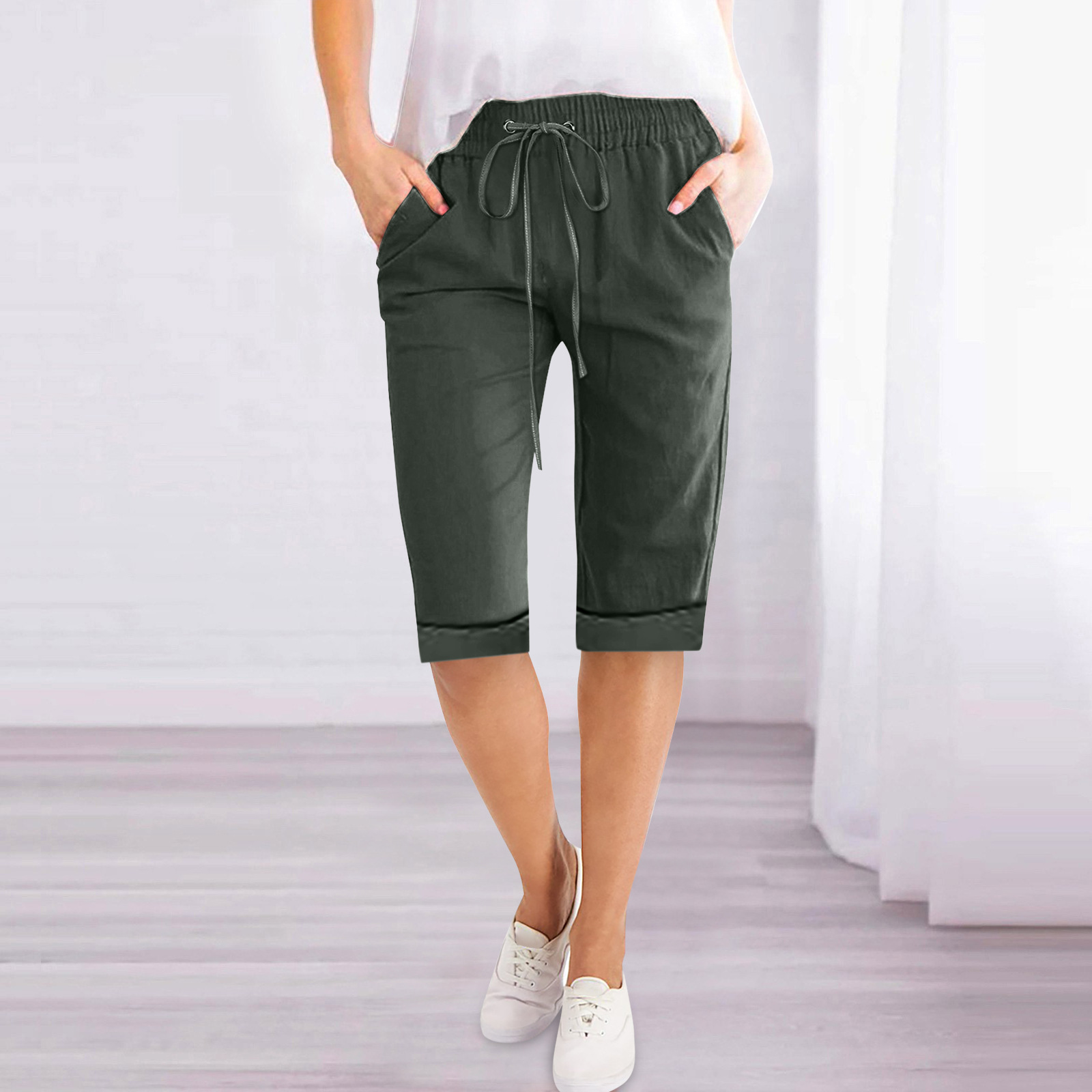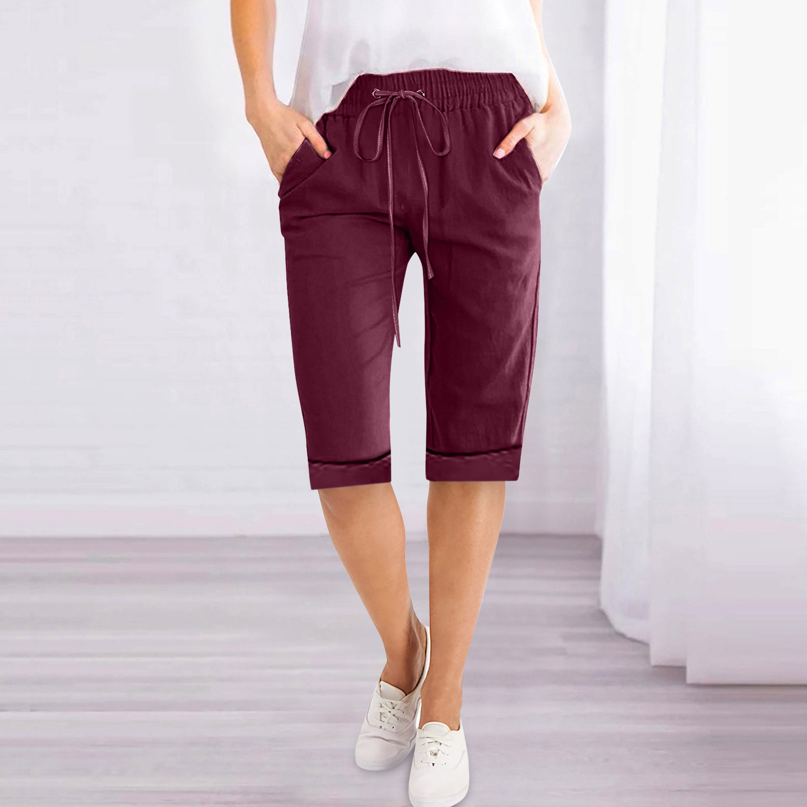 2023 Amazon Cross-border wish Women’s Solid Color Drawstring Cotton Linen Casual Loose Straight Pocket Home Pants