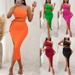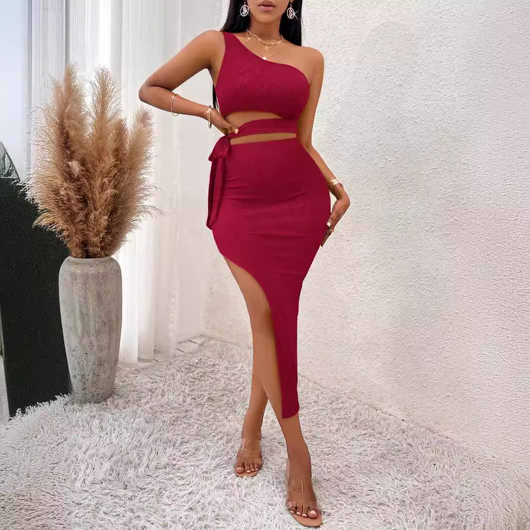 | nameOriginal | 2023 Amazon European and American New Foreign Trade Women's Summer Casual Solid Color Oblique Collar Tie Waist Knitted Hip Dress |