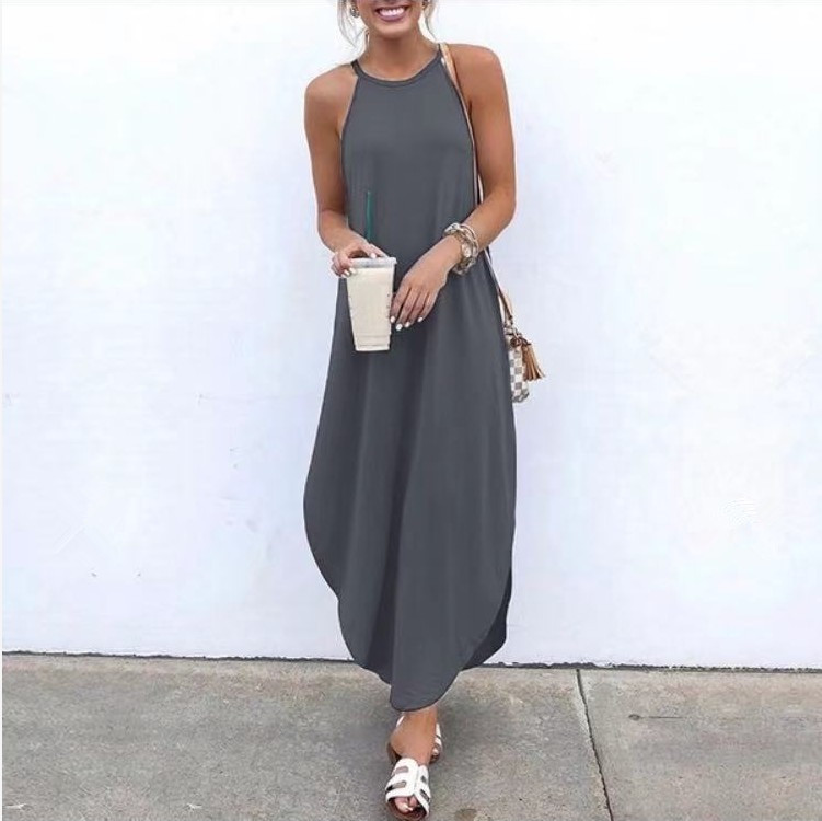 2023 Amazon wish AliExpress Europe and the United States cross-border new round neck solid color dovetail strap dress women 063