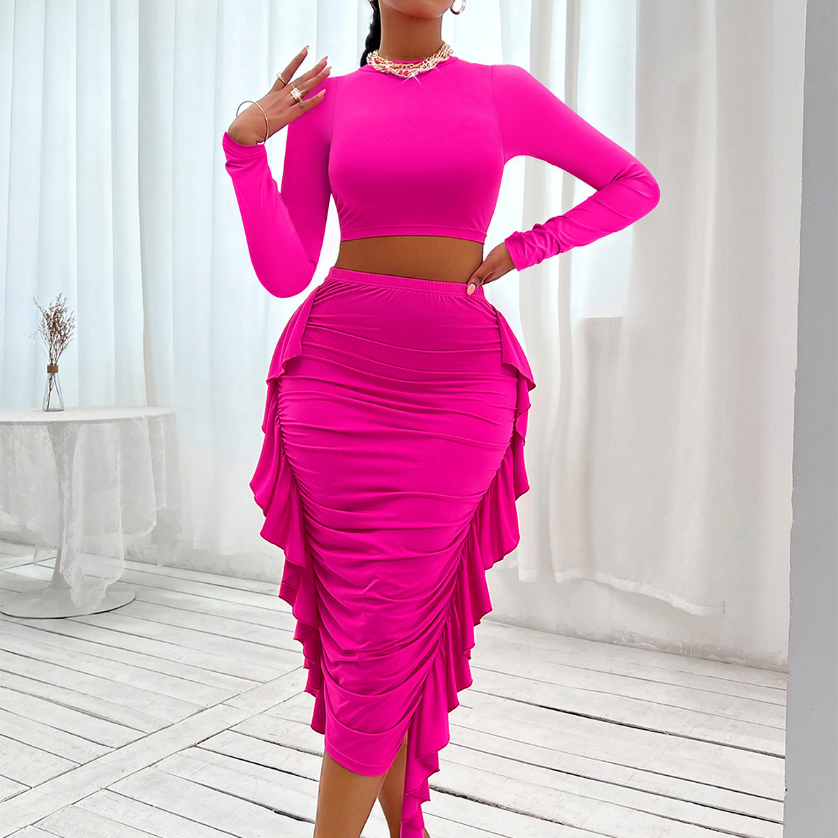 | nameOriginal | 2023 autumn and winter fashion sexy women's clothing European and American cross-border hot sale solid color round neck open waist long sleeve ruffle skirt suit |