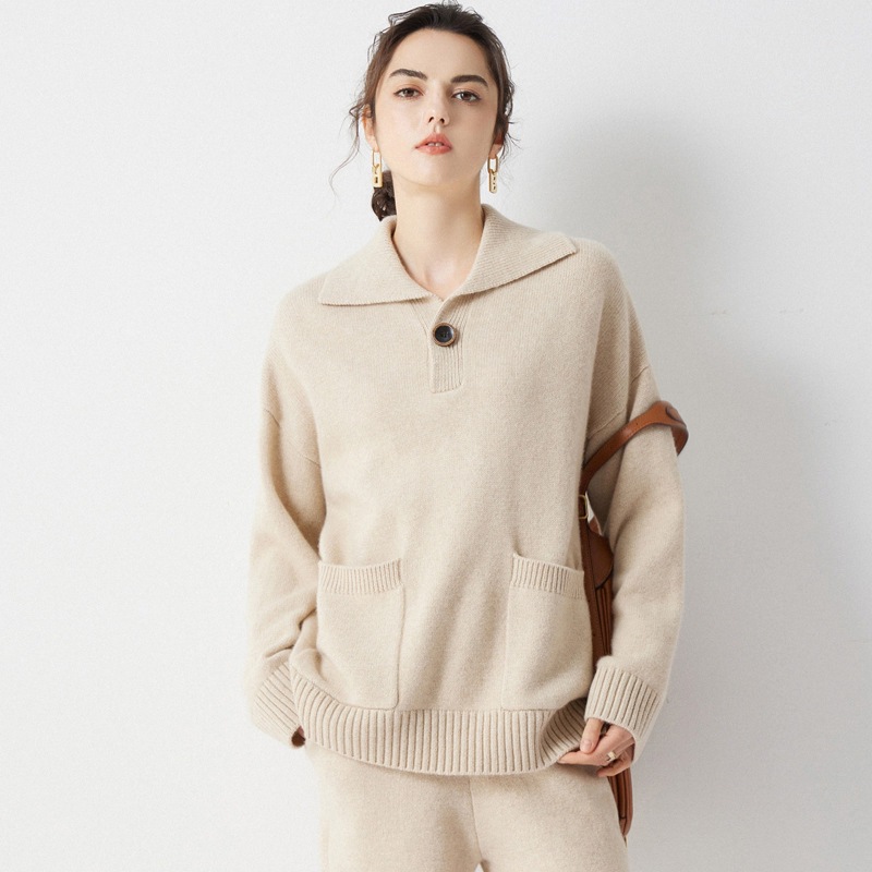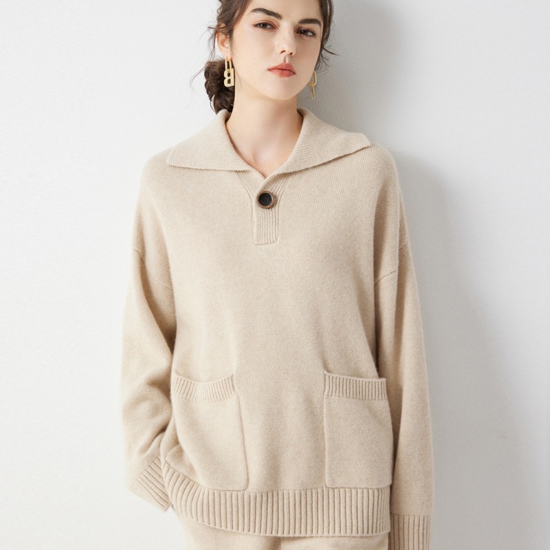2023 autumn and winter New cashmere sweater women's 100 pure cashmere lapel thick cashmere sweater solid color loose top