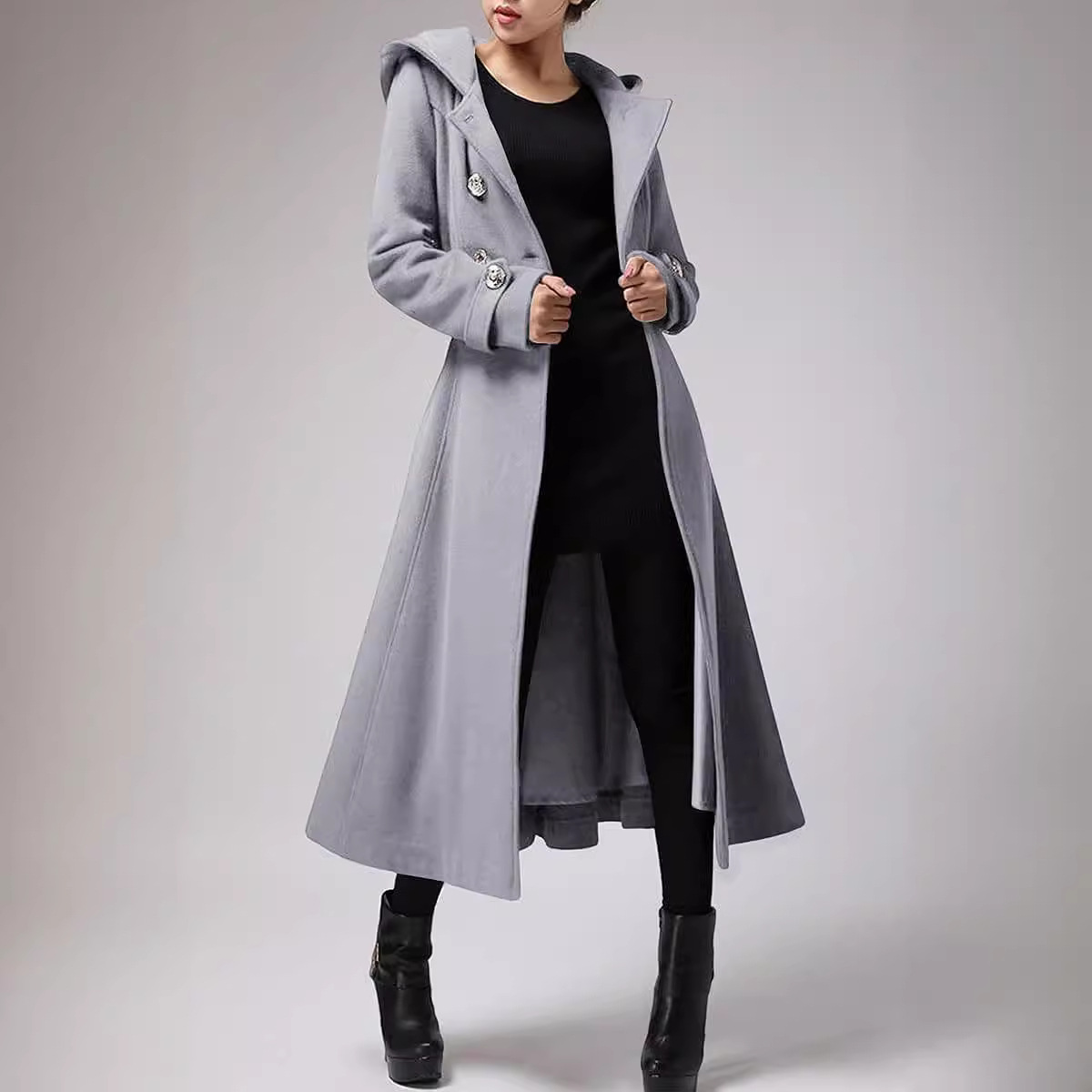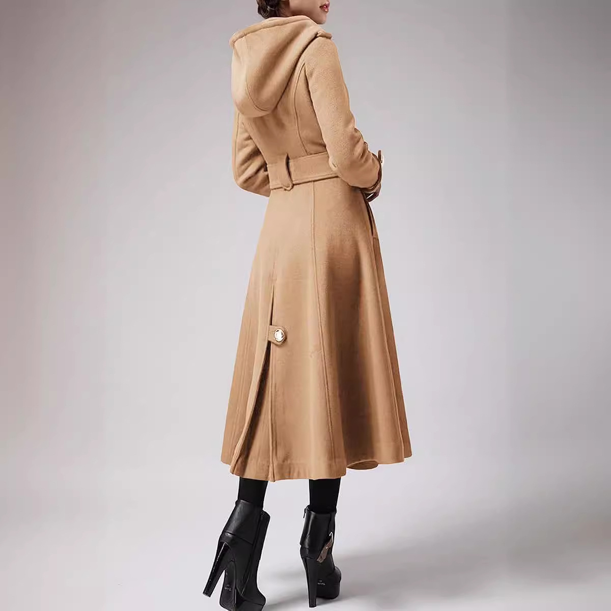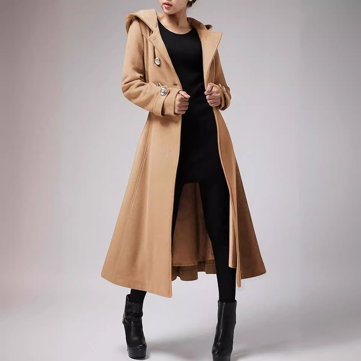 | nameOriginal | 2023 autumn and winter New elegant long women's coat skirt swing hooded lace-up slim cashmere coat |