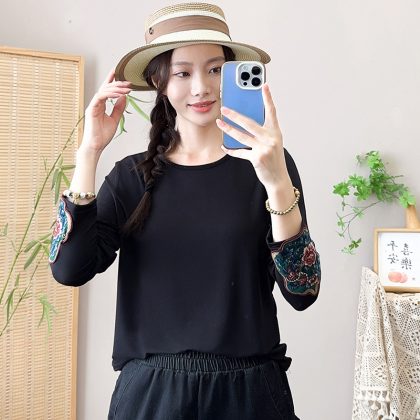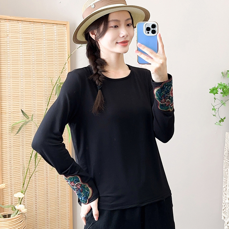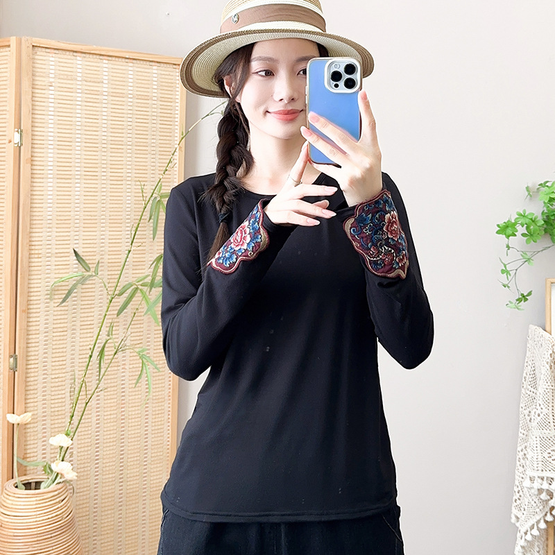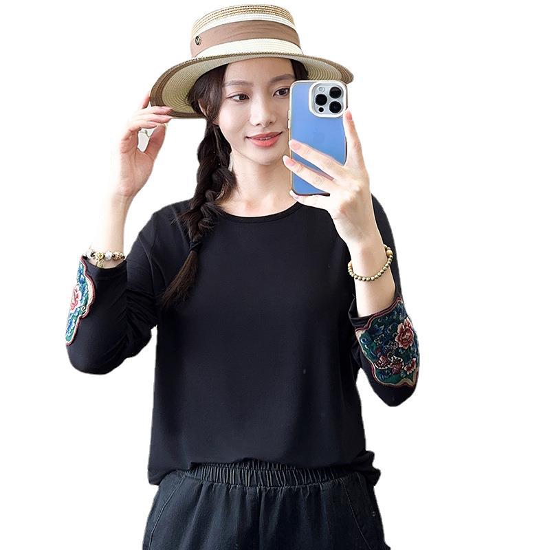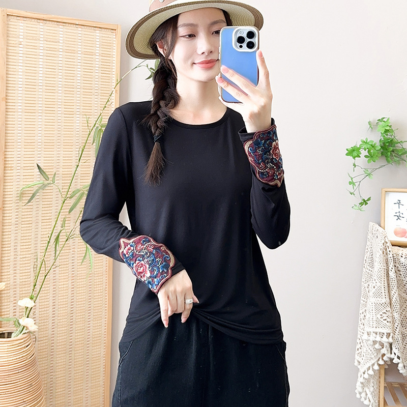 | nameOriginal | 2023 autumn and winter solid color ethnic style embroidered round neck inner long sleeve straight artistic modal cotton Women's bottoming shirt |
