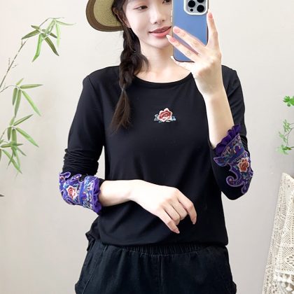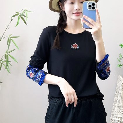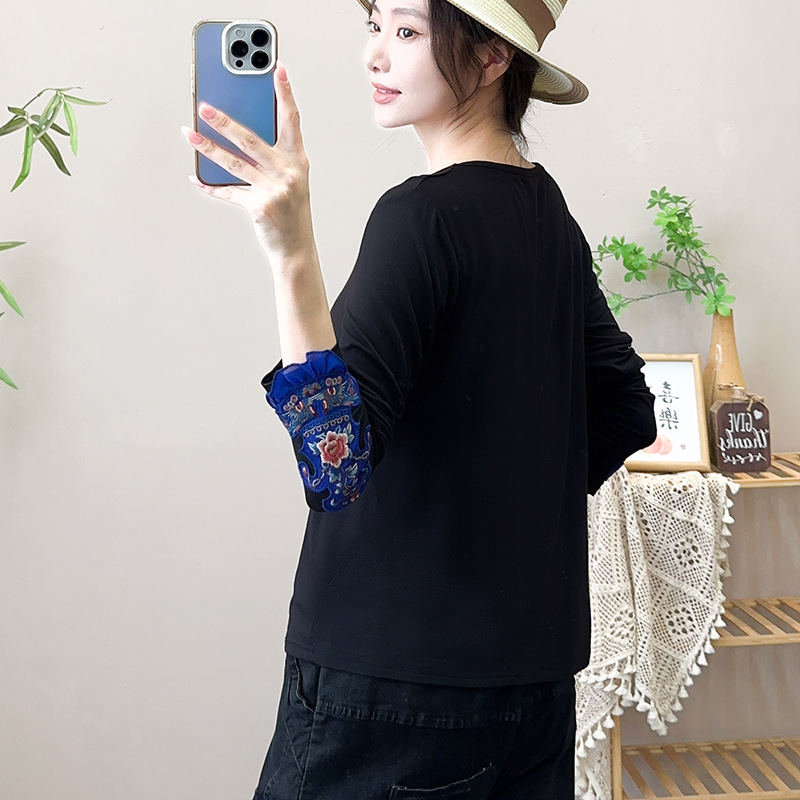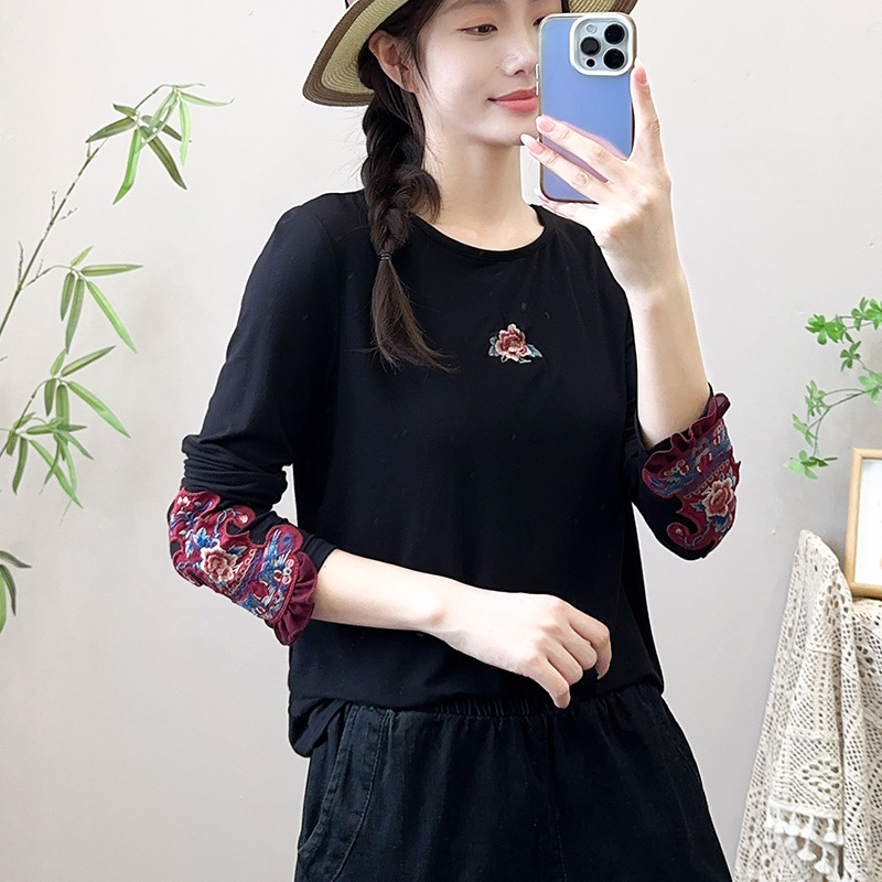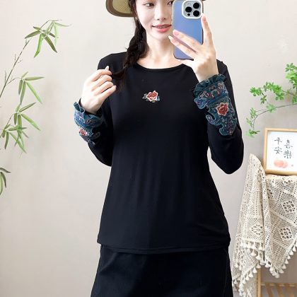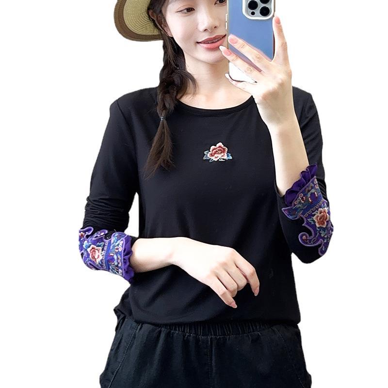2023 Autumn and Winter Solid Color Ethnic Style Sticker Embroidered Round Neck Long Sleeve Straight Artistic Solid Color Modal Cotton Base Shirt