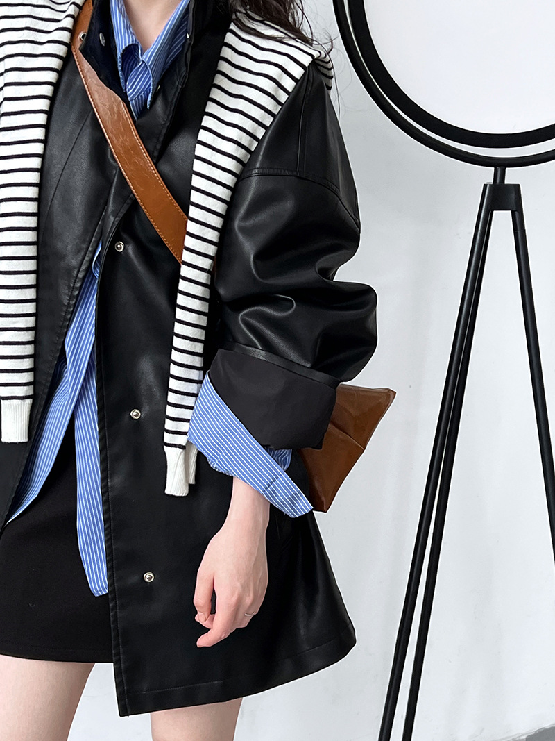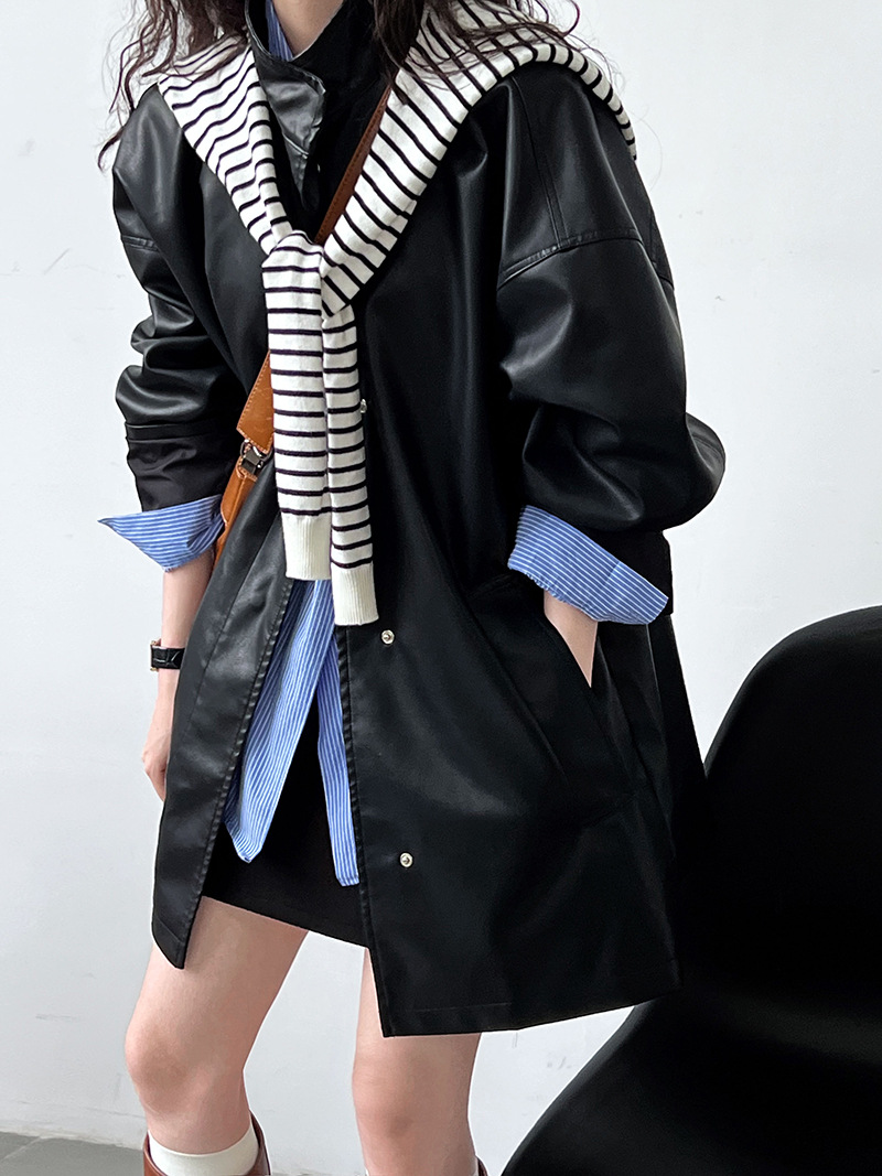 2023 autumn minimalist French neutral cool black silhouette stand collar long leather coat 8633