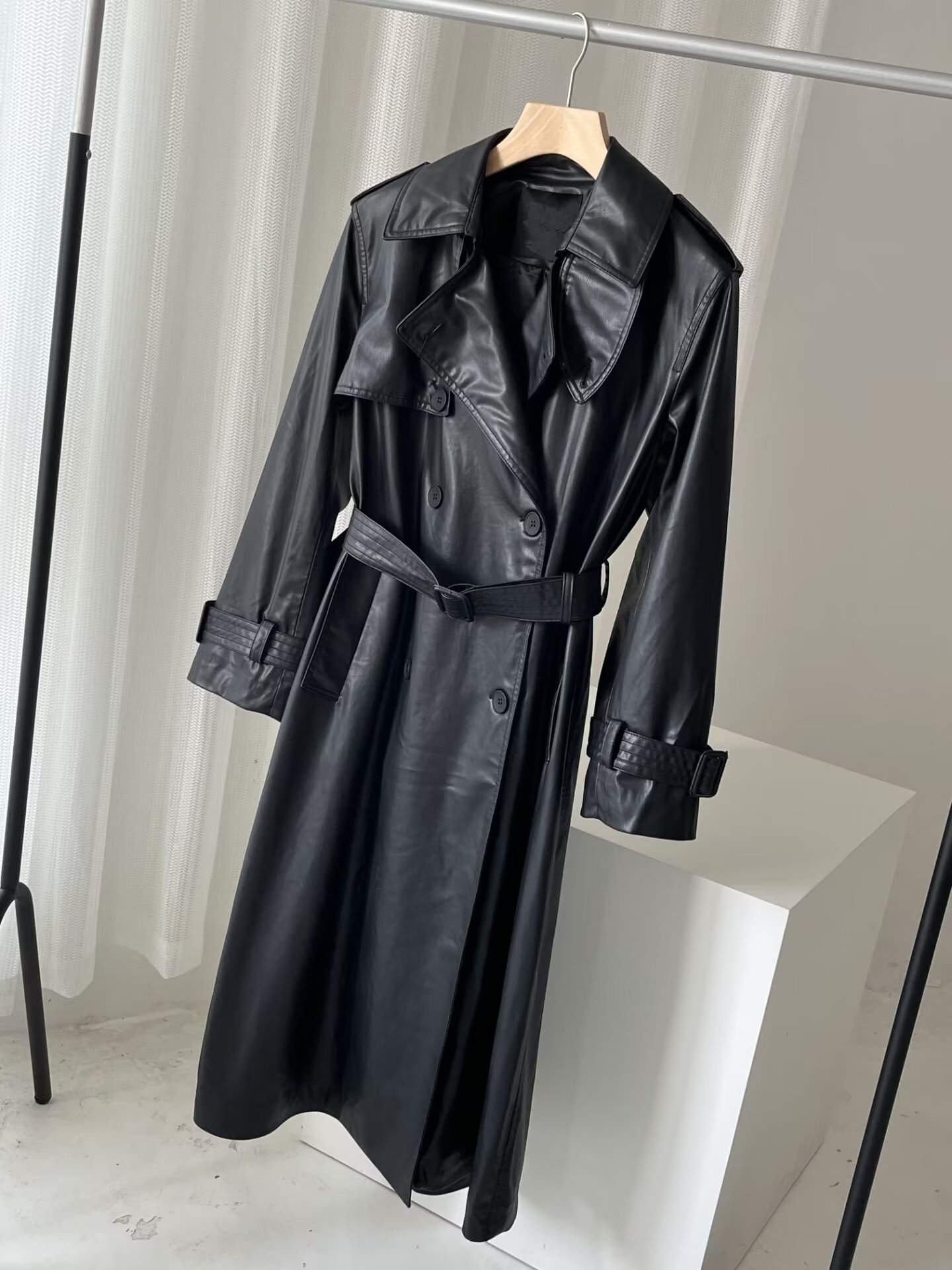 | nameOriginal | 2023 autumn new European and American style faux leather long trench coat women's autumn loose long sleeve mid-length trench coat |