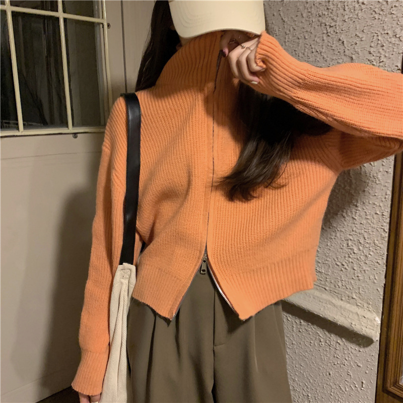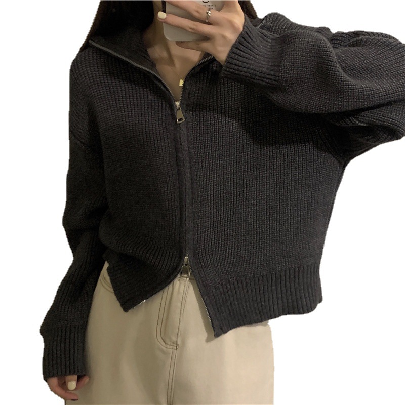 | nameOriginal | 2023 autumn new solid color knitted cardigan three-dimensional design sense double zipper long sleeve sweater short coat wholesale |