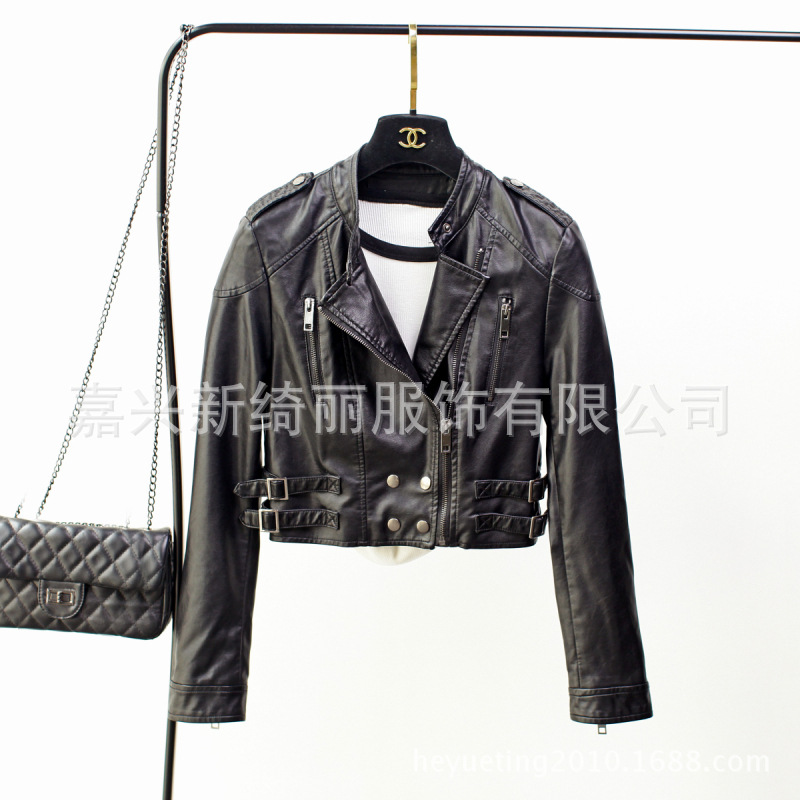 2023 autumn women's leather jacket short slim stand collar women's motorcycle jacket washed small leather coat