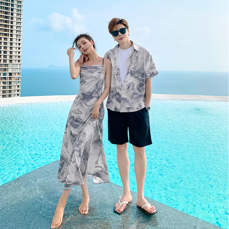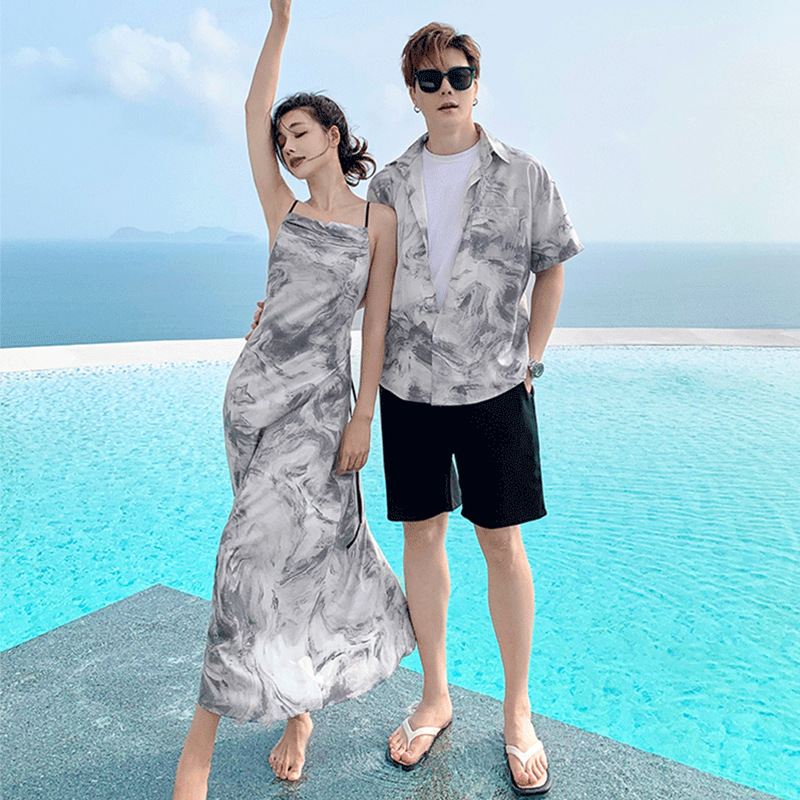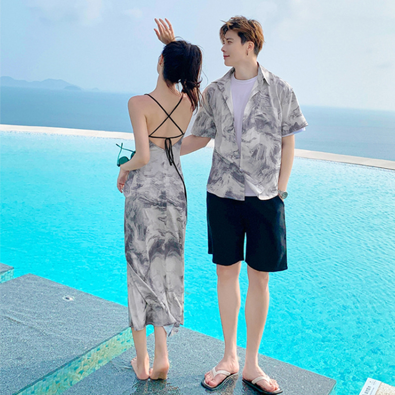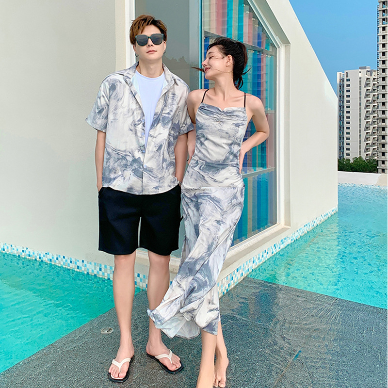 2023 Couple Dress Beach Seaside Travel Ink Painting Backless Strap Dress Men's Short Sleeve Shirt