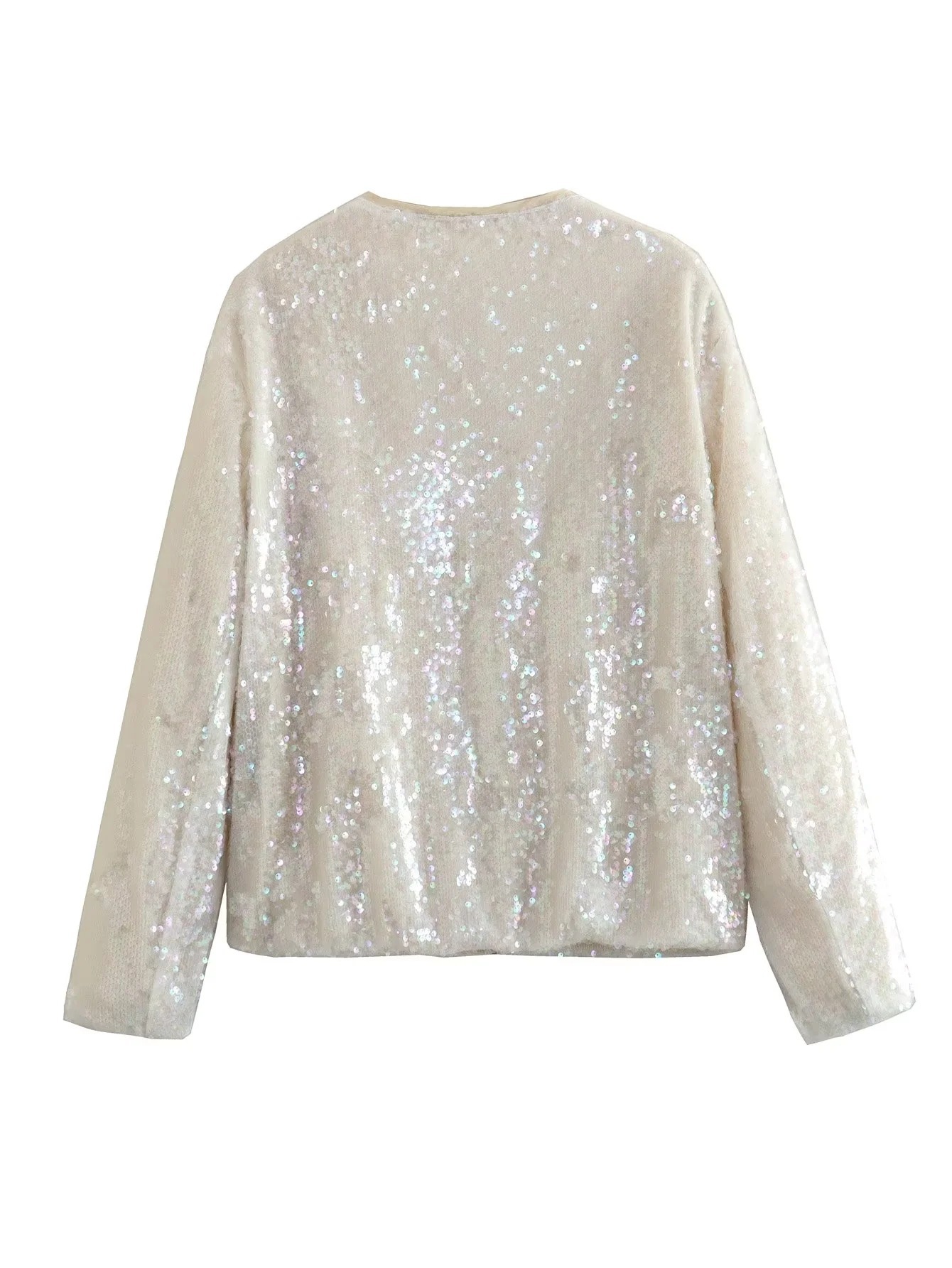 2023 Cross-border Spring New European and American Women's Fashion Round Neck Solid Color Sequin Jacket Short Casual All-match Small Jacket