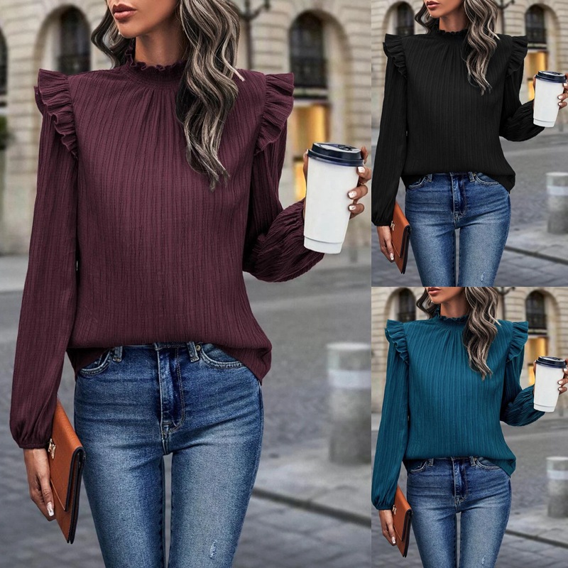 2023 European and American Amazon cross-border women’s clothing New ruffled stand collar stitching lotus leaf lantern sleeve temperament women’s top