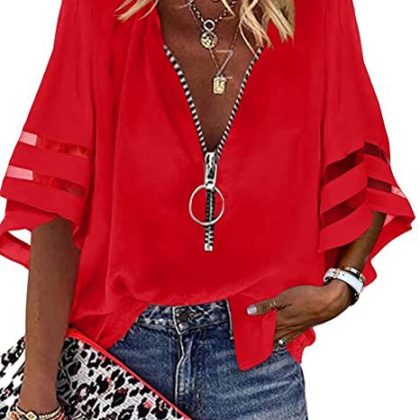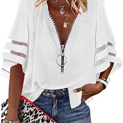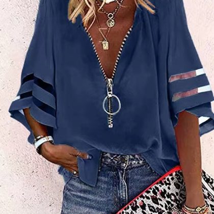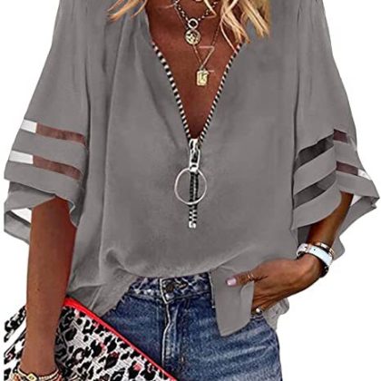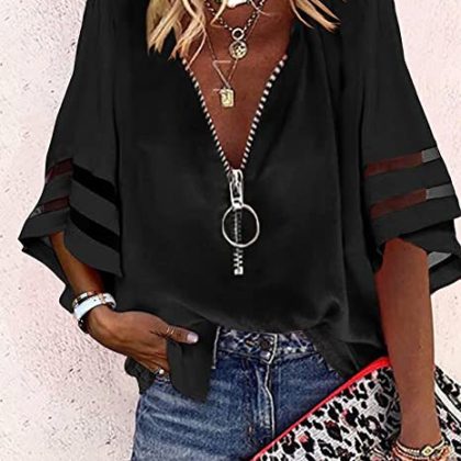 | nameOriginal | 2023 European and American Amazon new V-neck zipper shirt half bell sleeve mesh stitching loose casual shirt for women |