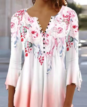 | nameOriginal | 2023 European and American cross-border new spring and summer mid-sleeved V-neck slim-fit printed top for women |