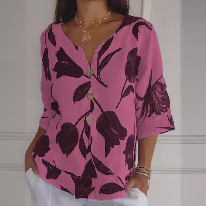 | nameOriginal | 2023 European and American independent station Amazon AliExpress new printed cotton and linen V-neck short sleeve pullover shirt |