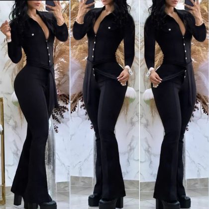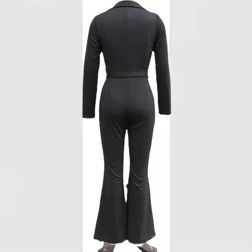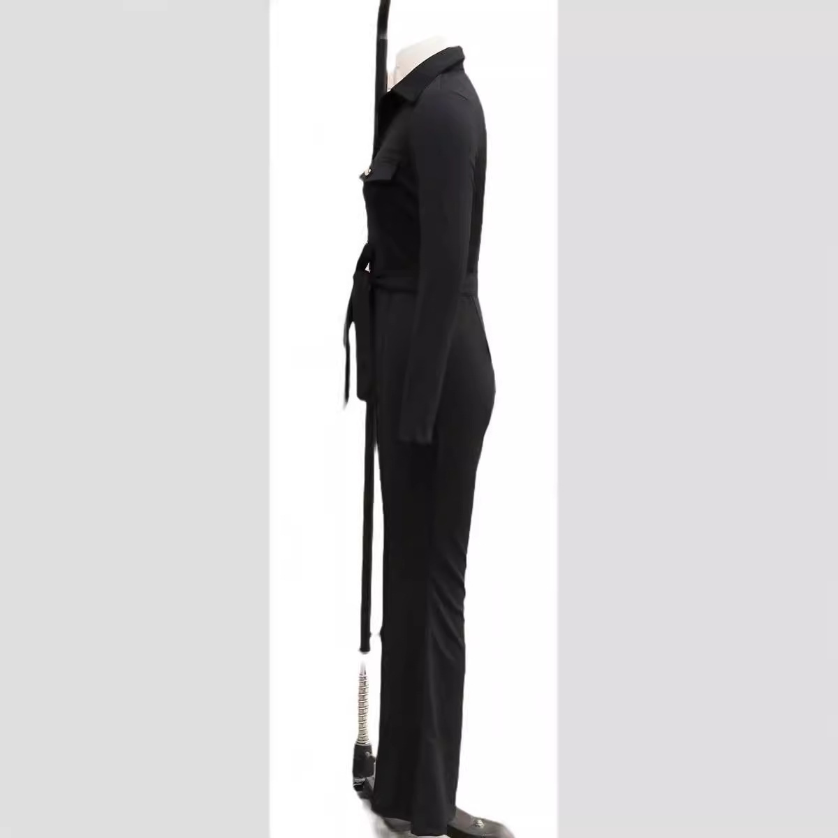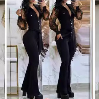 2023 European and American women’s elegant mesh sleeve V-neck button pocket high waist lace-up solid color slim jumpsuit