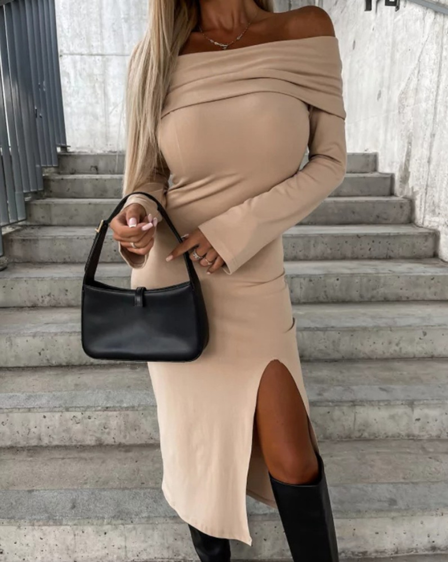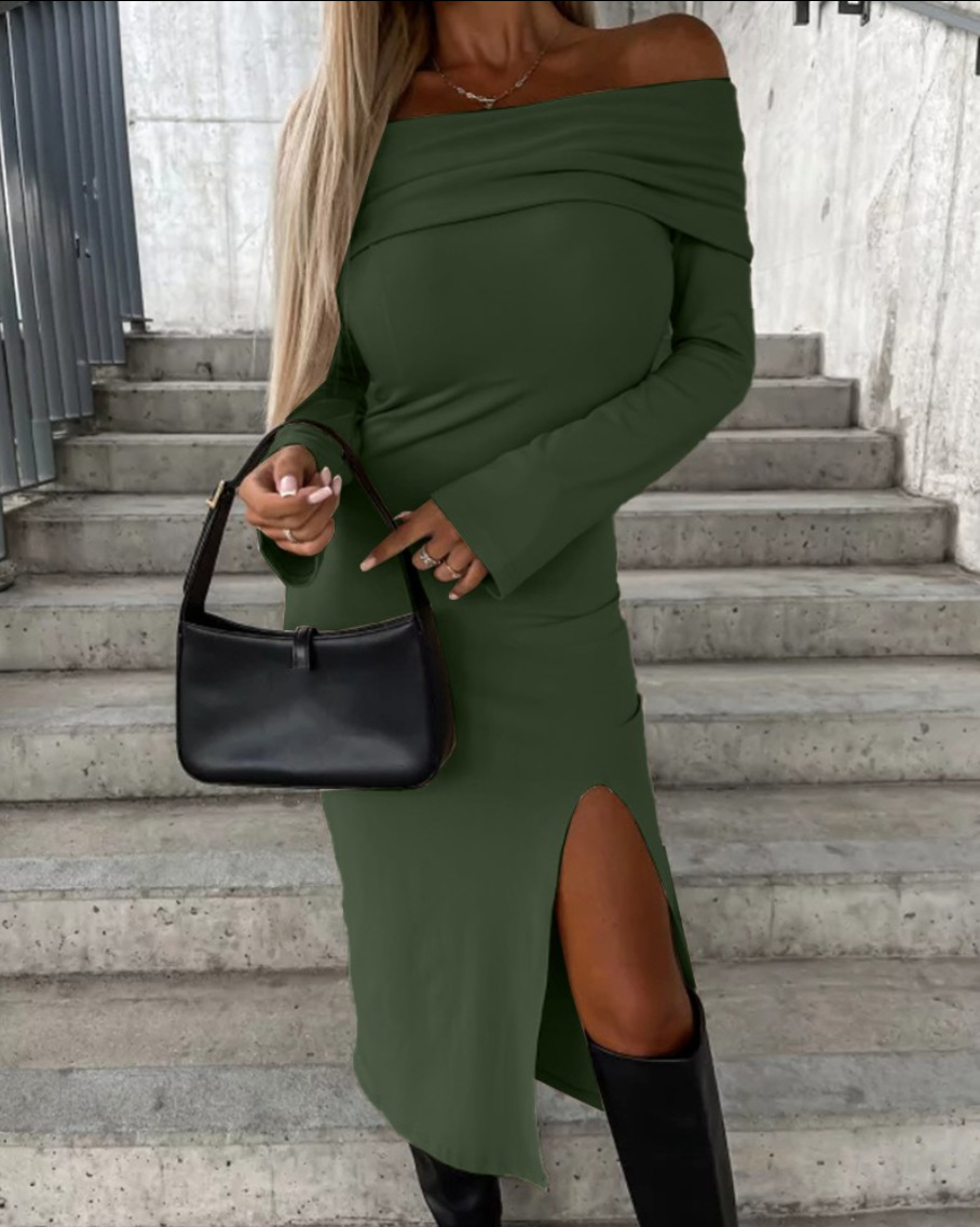 | nameOriginal | 2023 Independent station wish Amazon popular autumn and winter New long sleeve solid color off-neck slit dress women |