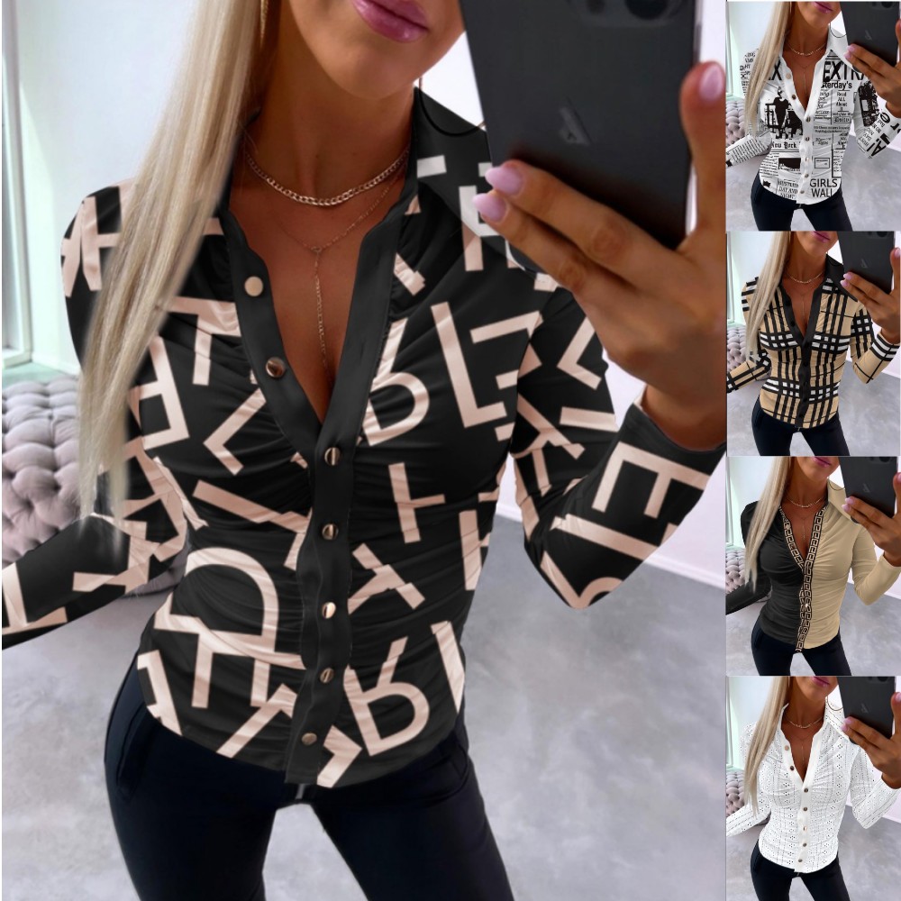 2023 Independent station wish Amazon popular autumn sexy V-neck printed women’s shirt women’s shirt
