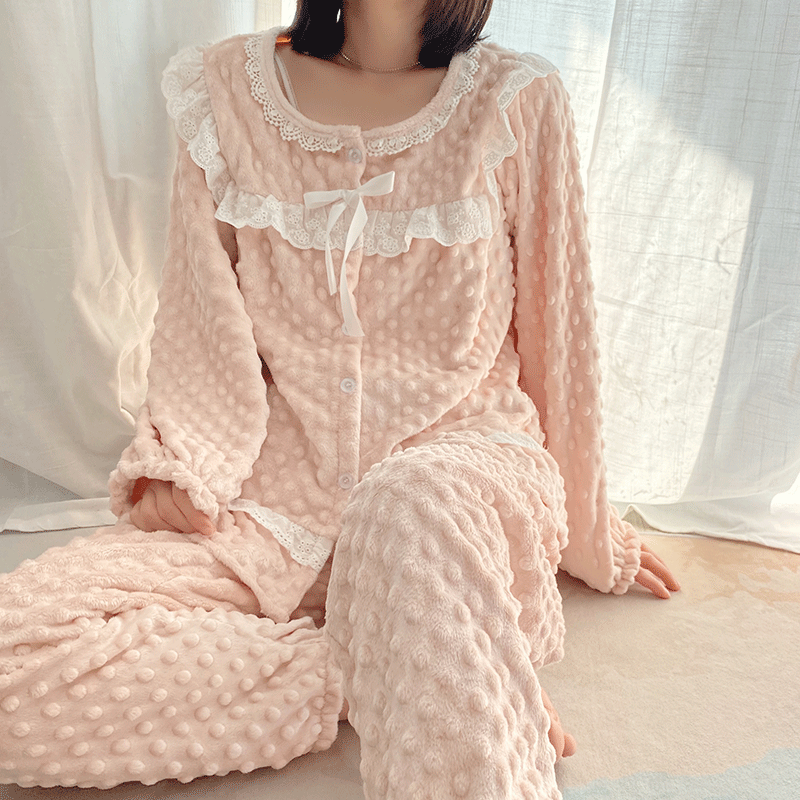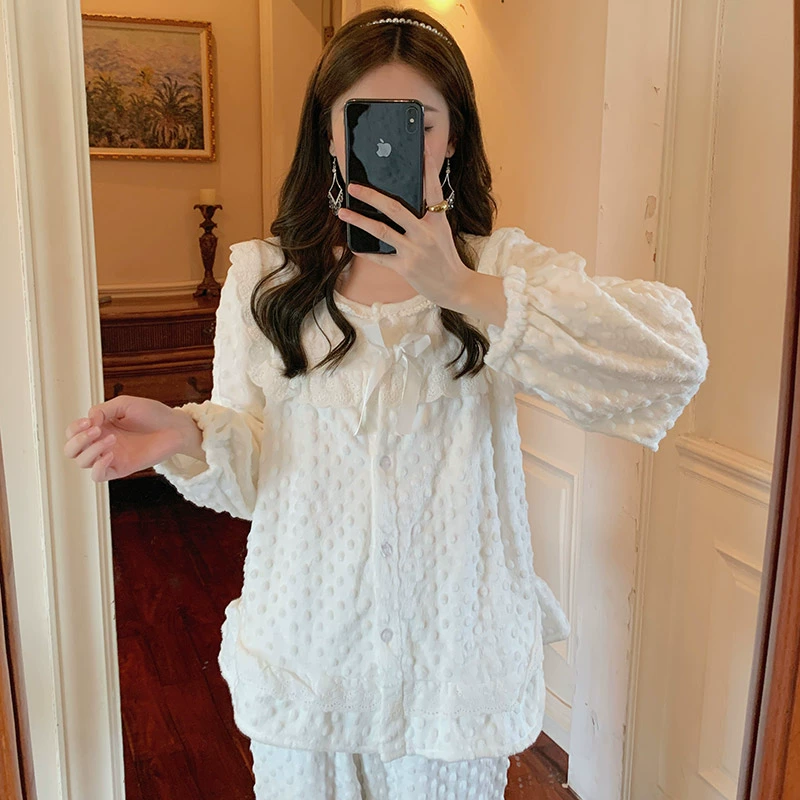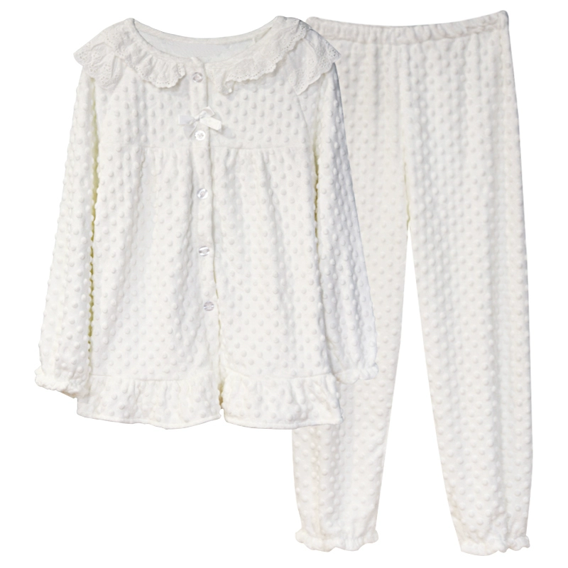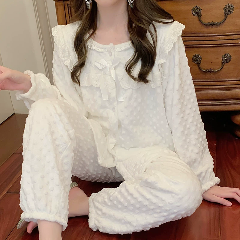 | nameOriginal | 2023 Korean milk velvet pajamas for women autumn and winter plus velvet flannel round neck princess style white coral velvet home clothes |