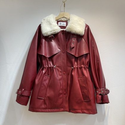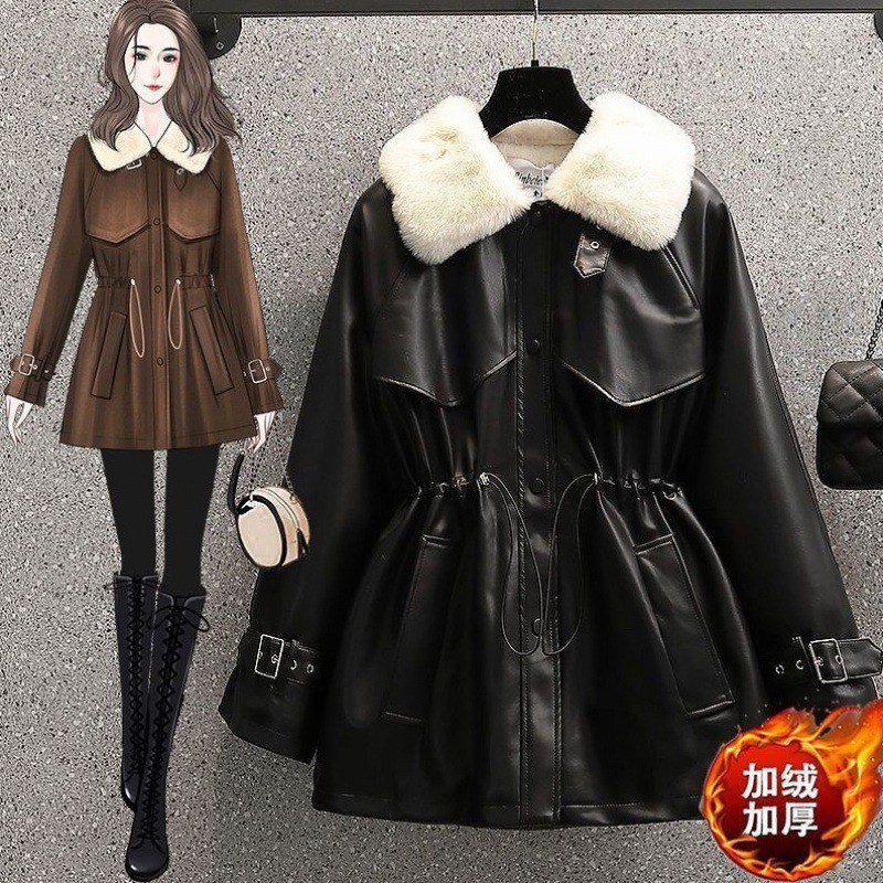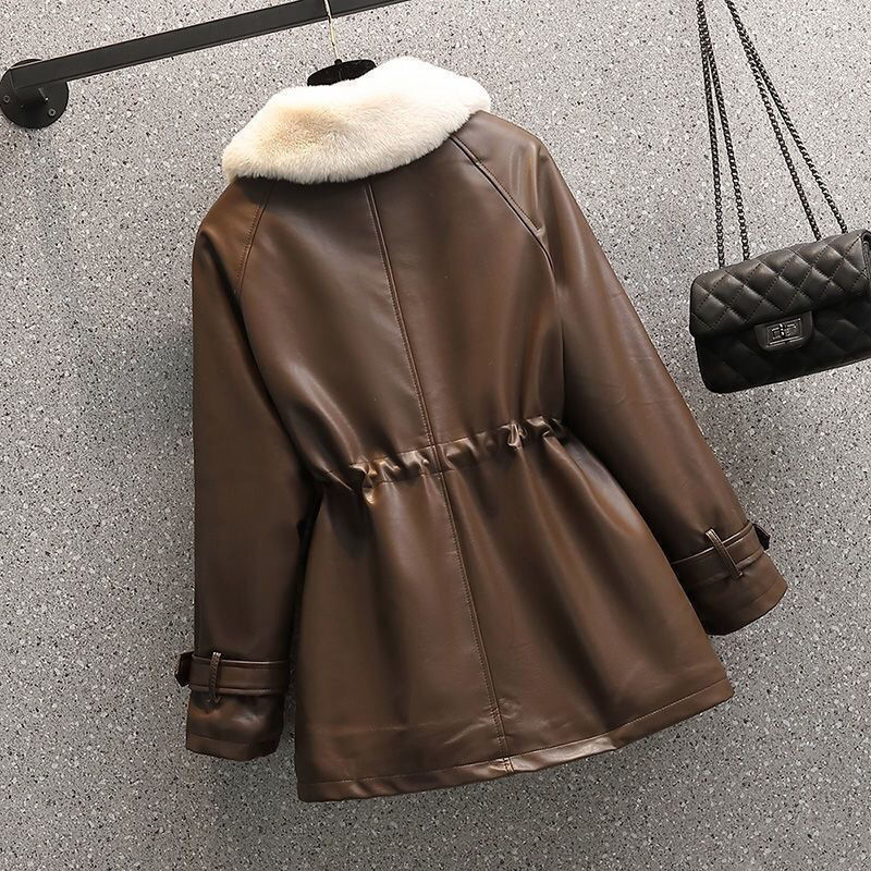 2023 Maillard lapel Western style outerwear leather coat female motorcycle style autumn and winter fleece-lined thickened imitation rabbit velvet coat female