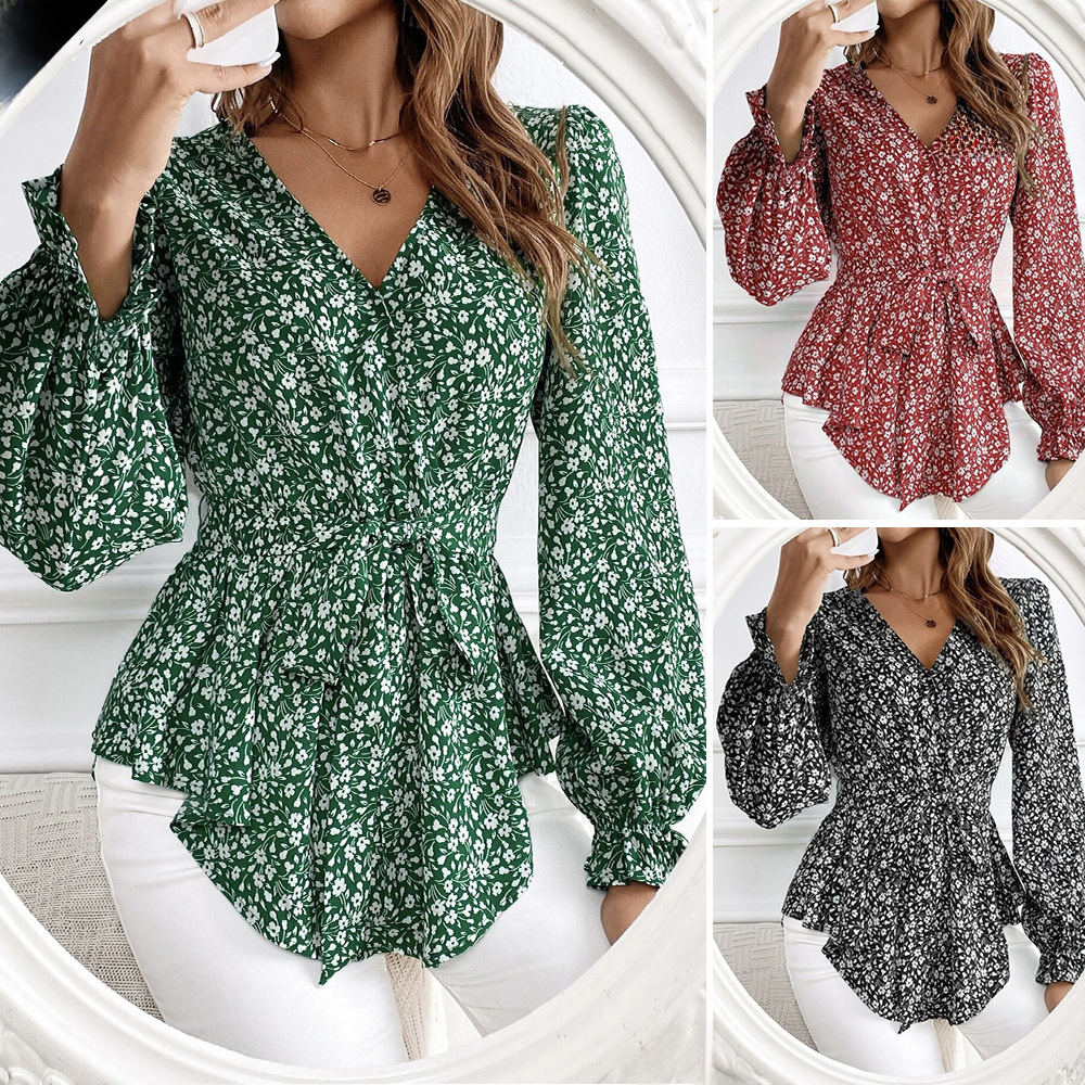 | nameOriginal | 2023 New Cross-border Amazon Foreign Trade V-neck Pullover Floral Waist Long Sleeve Elegant Commuter Blouse |