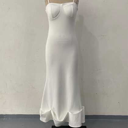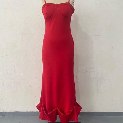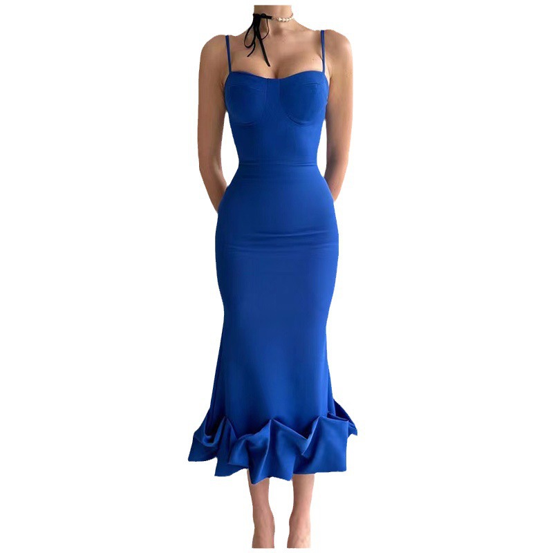 2023 new European and American Amazon spaghetti strap ball ruffled hem sleeveless high waist tight dress