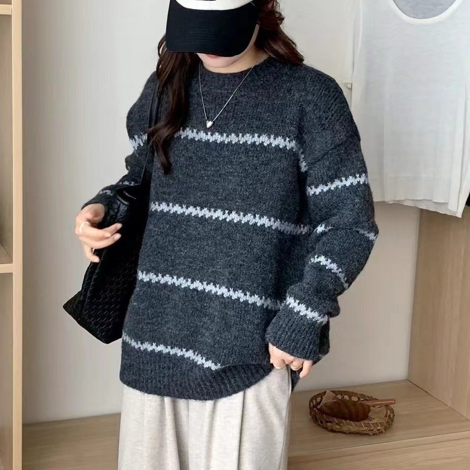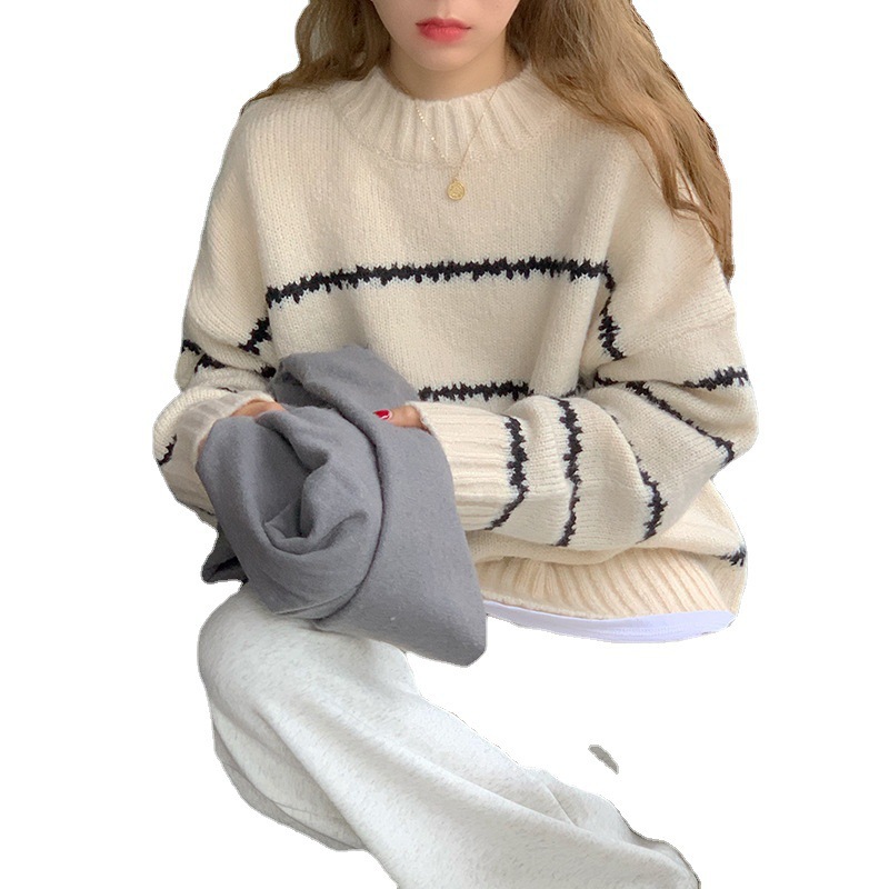 2023 new fashion style versatile retro lazy wind blouse knitted striped sweater for women loose autumn and winter