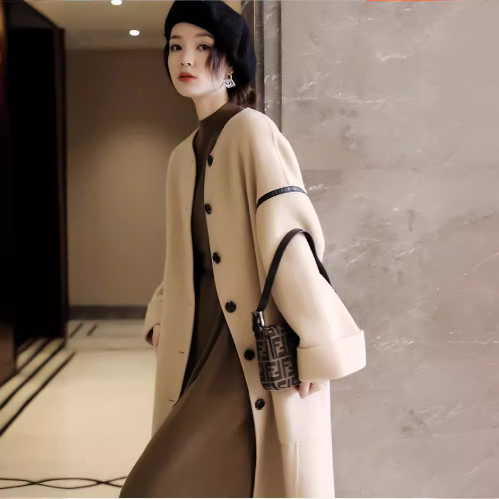 | nameOriginal | 2023 new French modern patchwork leather design micro wide collarless long cashmere double-sided woolen coat |