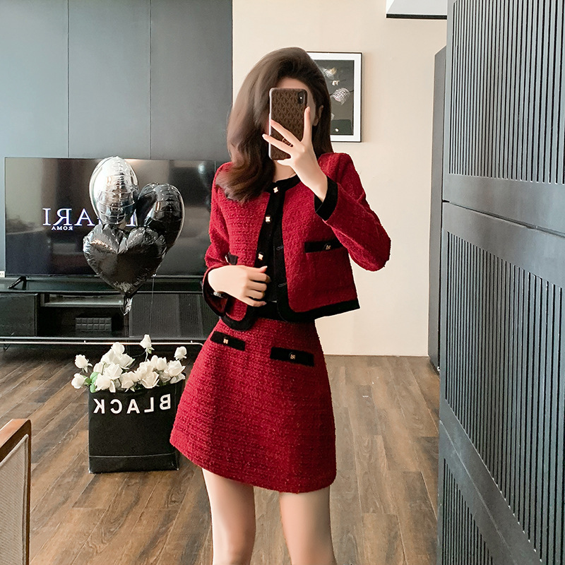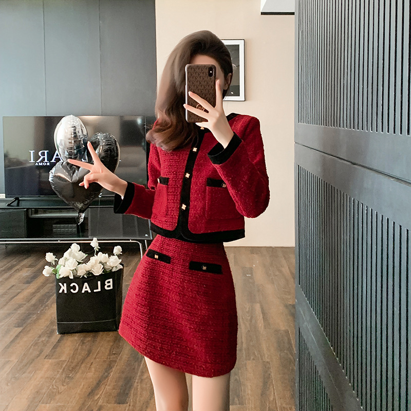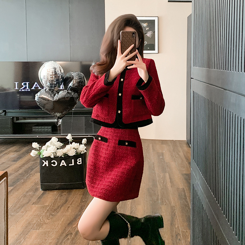 | nameOriginal | 2023 new French red Chanel style autumn and winter New socialite light luxury bow skirt two-piece set |