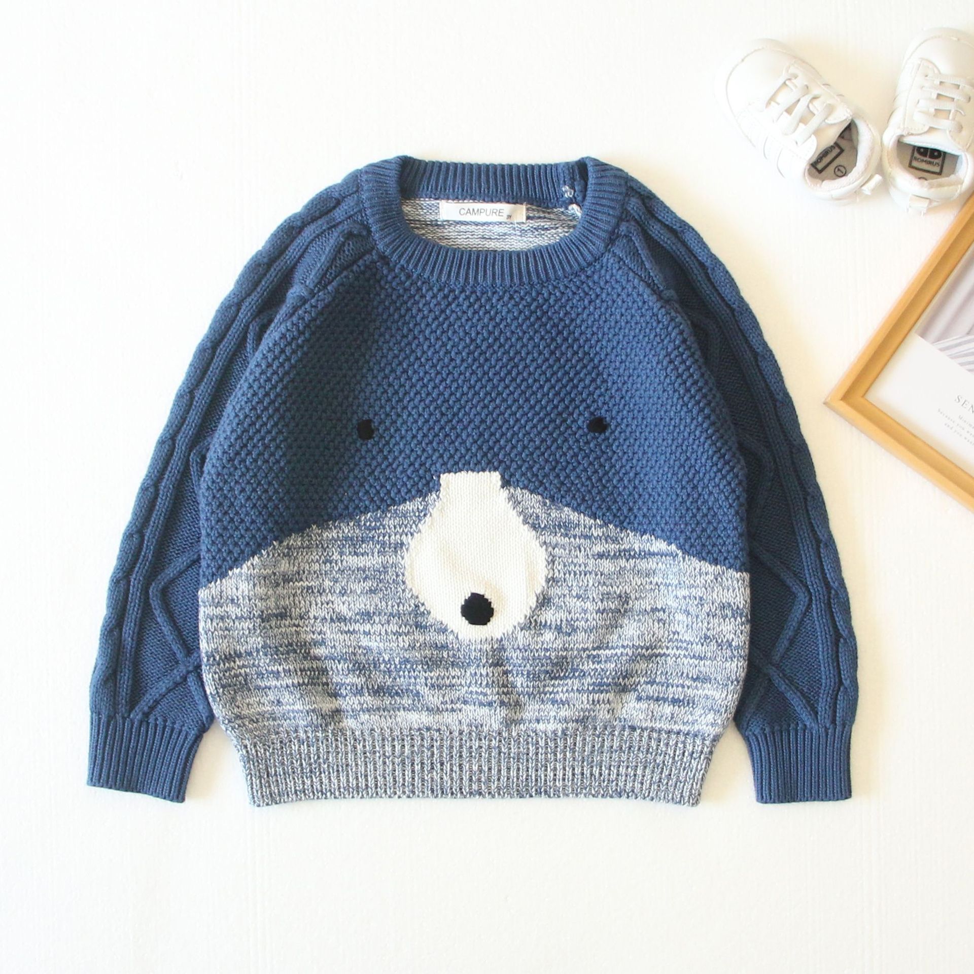 2023 New Knitted Children's Autumn and Winter Pullover Pure Cotton Young Men's and Women's Cute All-match Cartoon Polar Bear Face Stitching