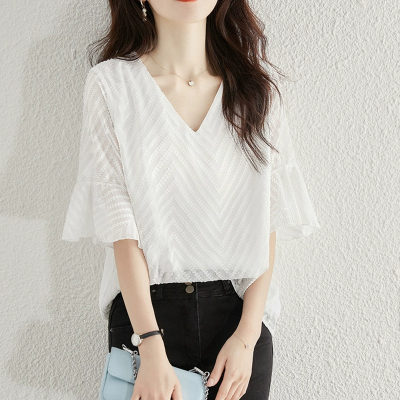 | nameOriginal | 2023 new summer style loose belly-covering five-quarter sleeve v-neck trumpet sleeve chiffon top women's slim and versatile shirt |