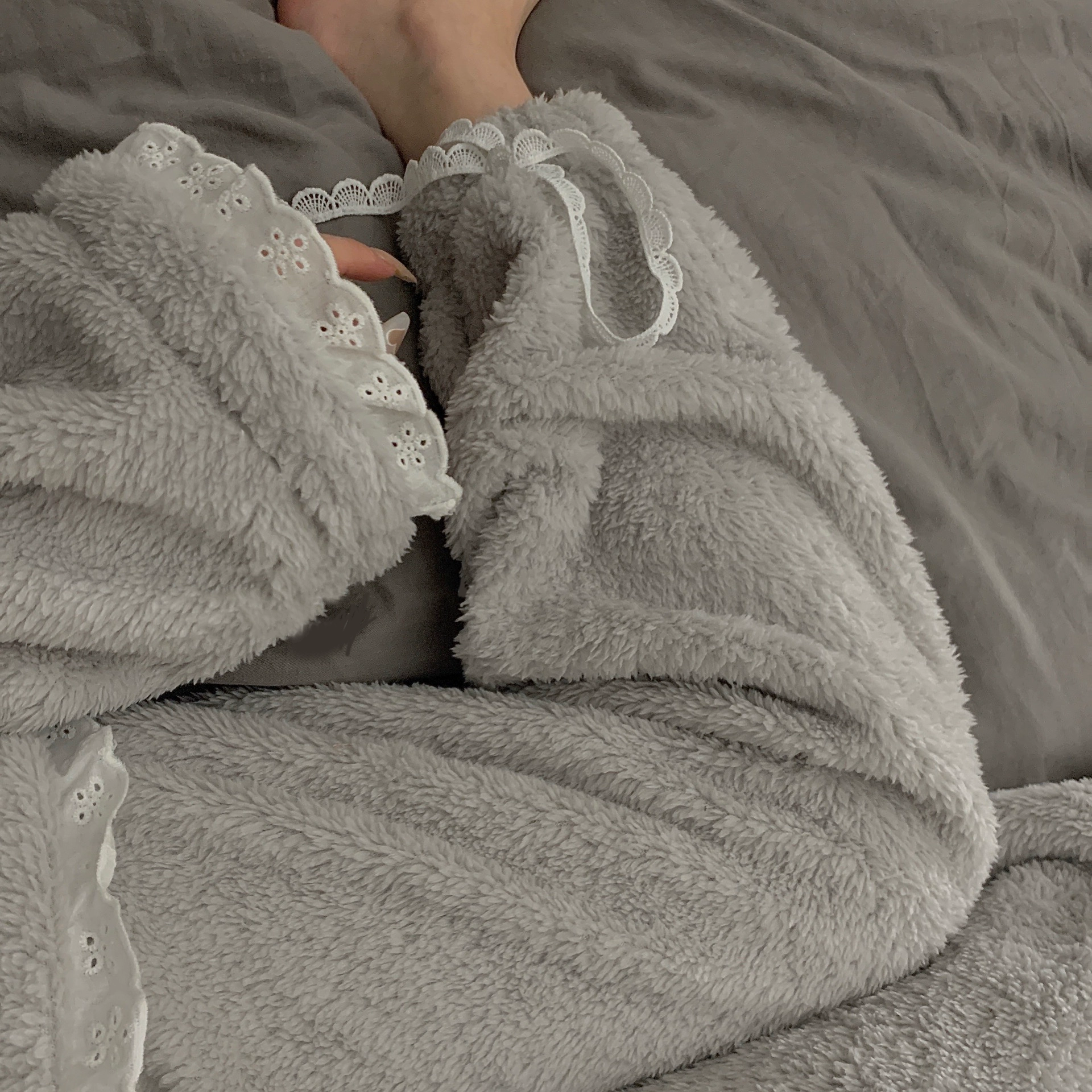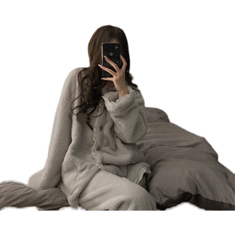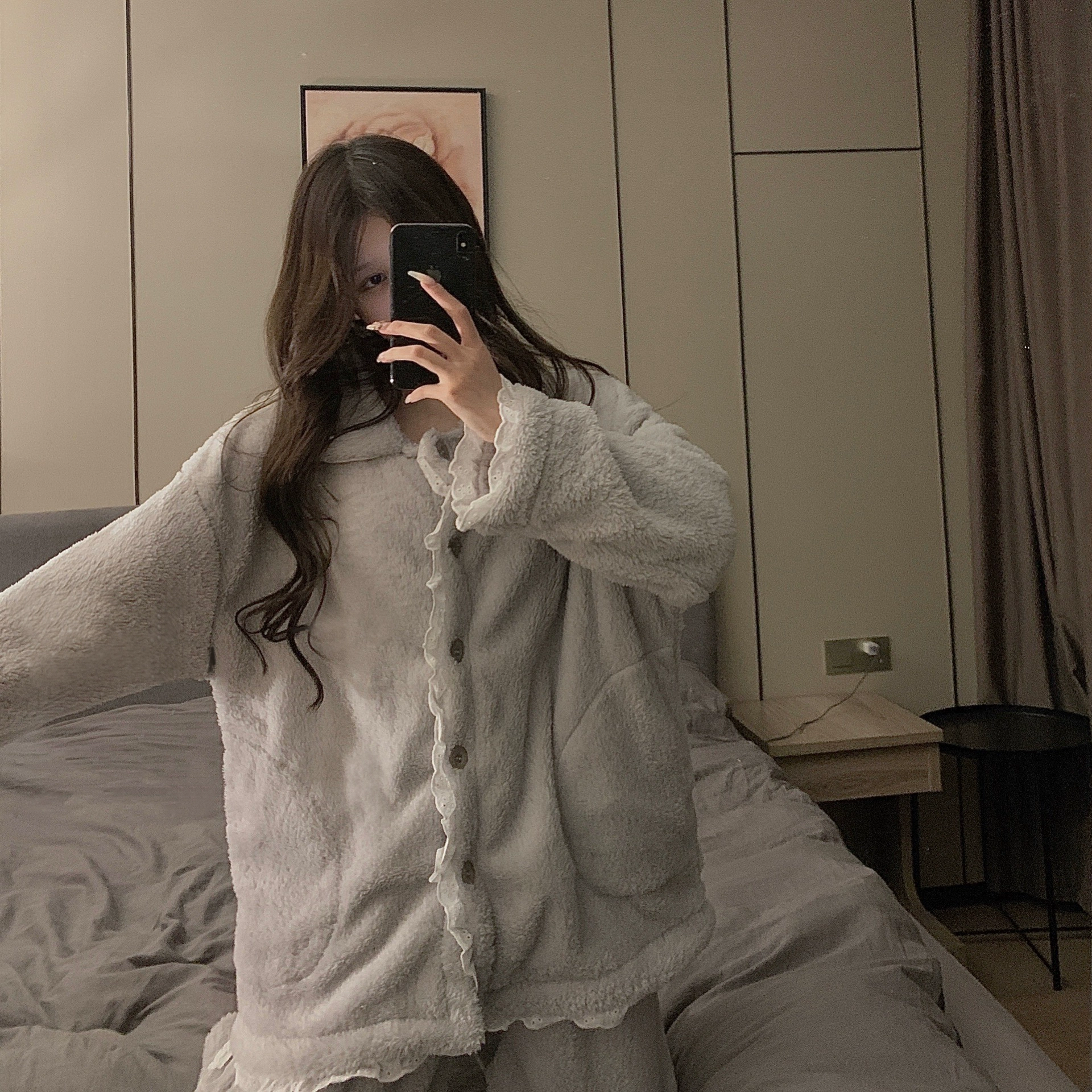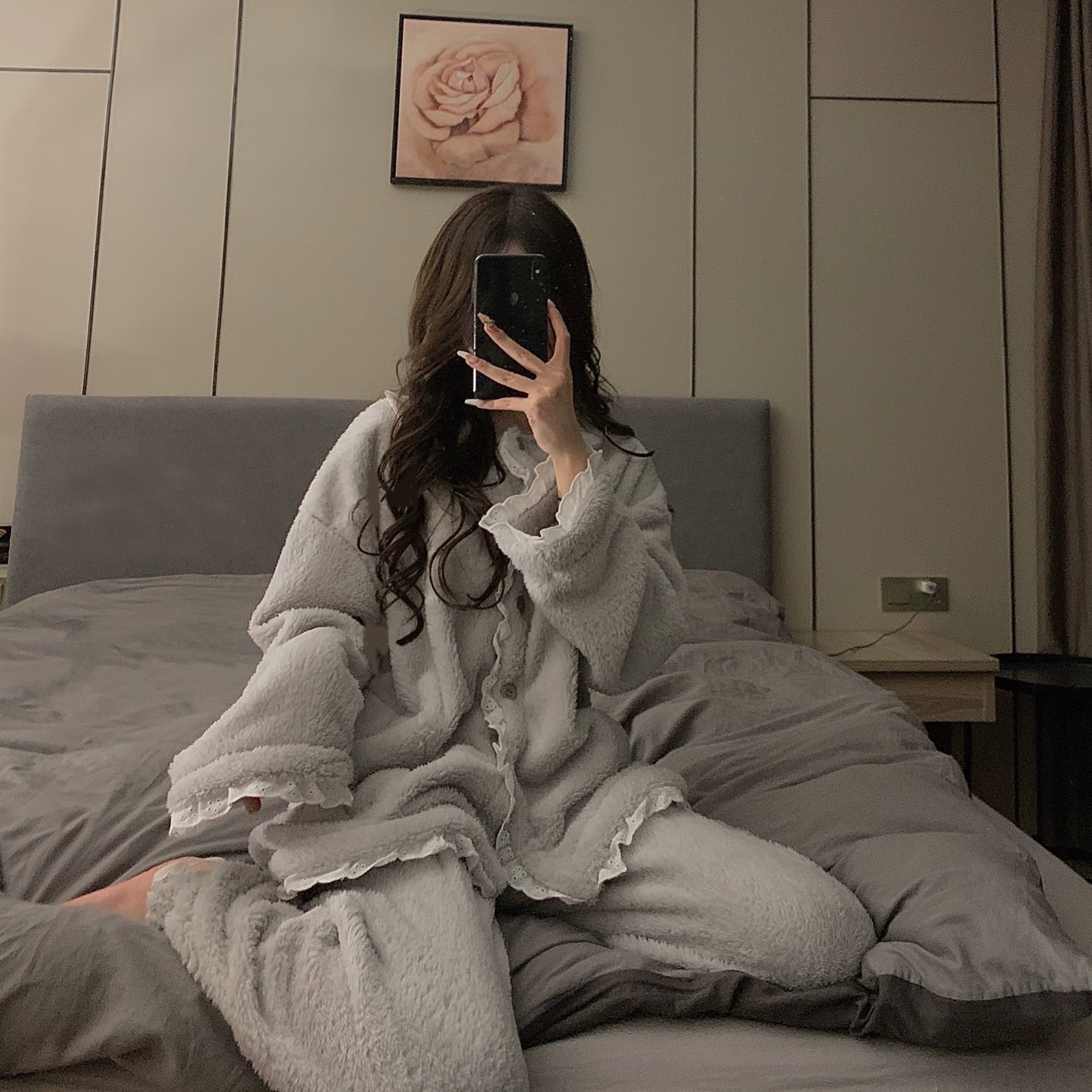 | nameOriginal | 2023 new winter velvet thickened casual solid color cardigan home wear two-piece set lace warm pajamas for girls |