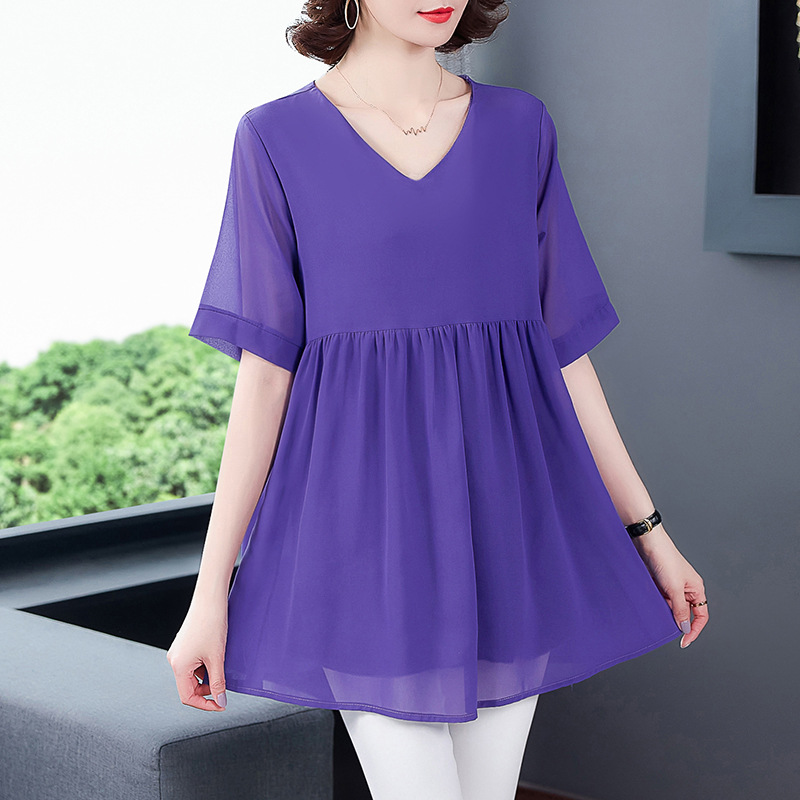 2023 Plus Size Western Style Chiffon Shirt Women's Short-Sleeved Summer Loose Belly-Covering Top for Chubby Girls Women's Mid-Sleeve Small Shirt
