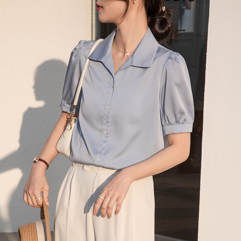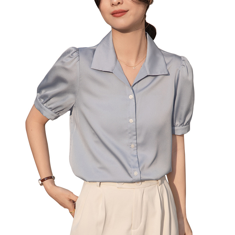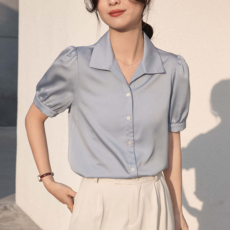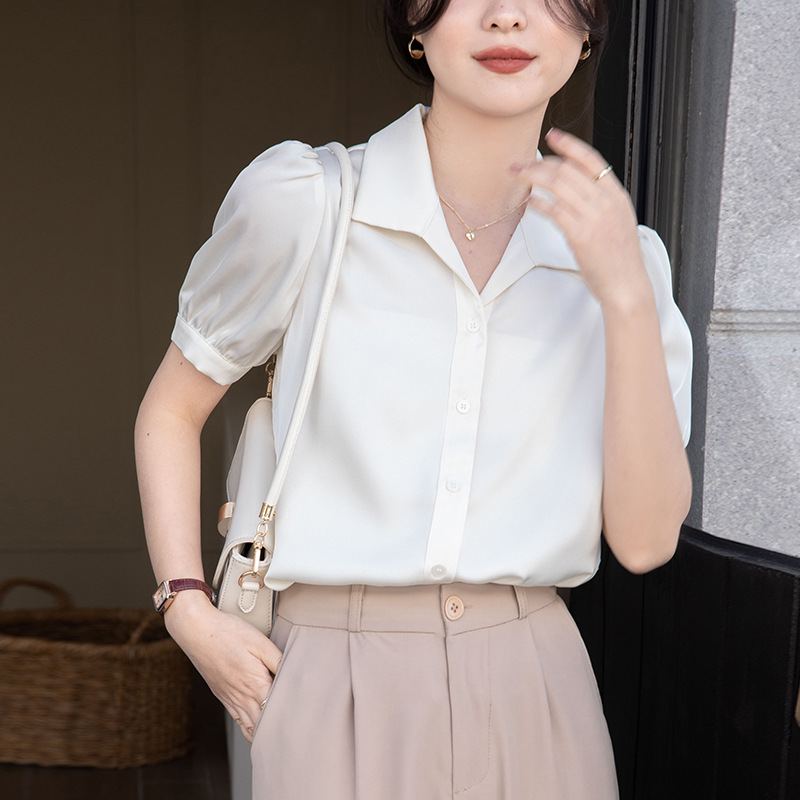 | nameOriginal | 2023 Real Shot New Style Small High-grade Satin Chiffon Short-sleeved White Shirt Women's Summer Commuter Slim Look Top |