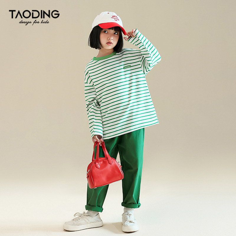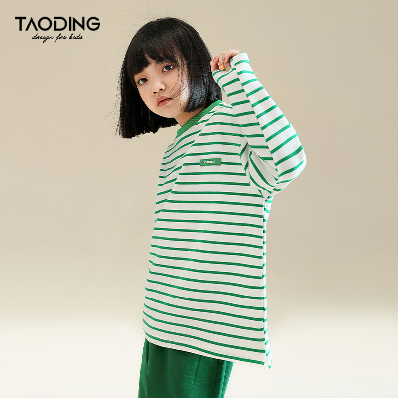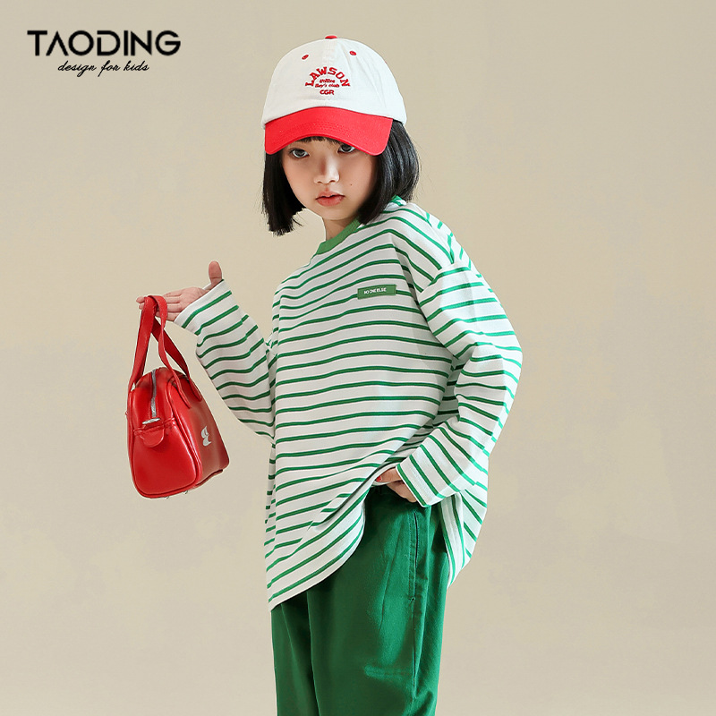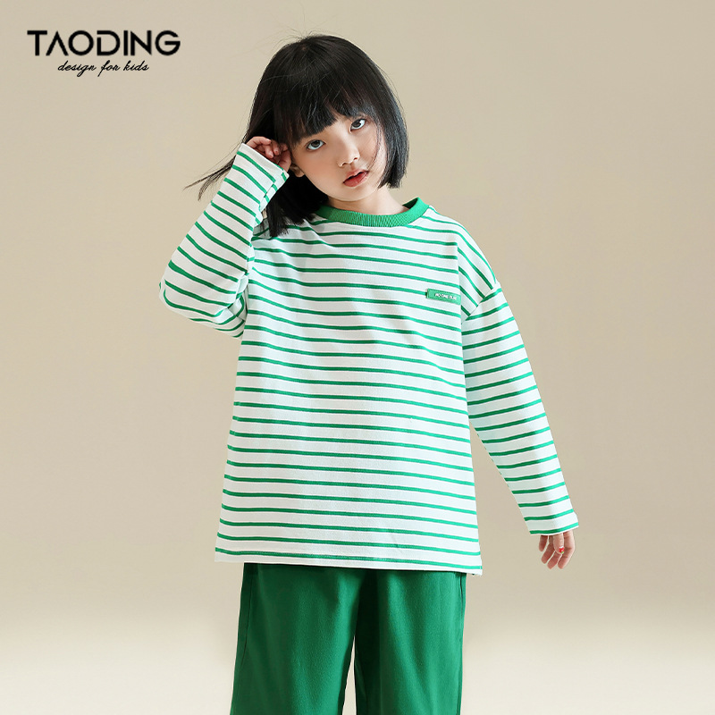 2023 Spring and Autumn New Girls’ T-shirt Big Kids Casual Loose Striped Top Round Neck Base Shirt Long Sleeve Trendy