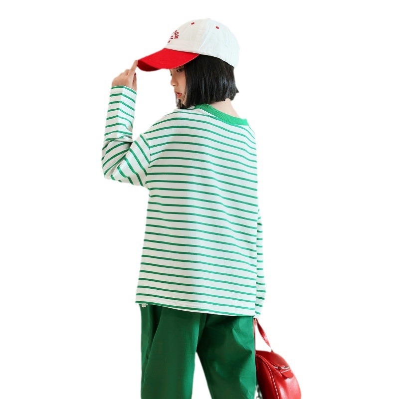 2023 Spring and Autumn New Girls' T-shirt Big Kids Casual Loose Striped Top Round Neck Base Shirt Long Sleeve Trendy