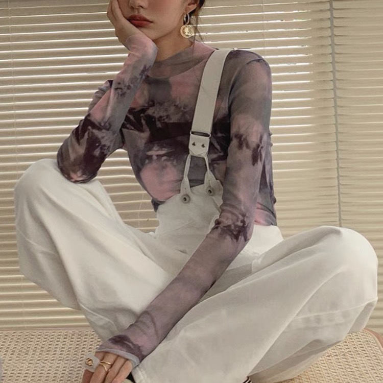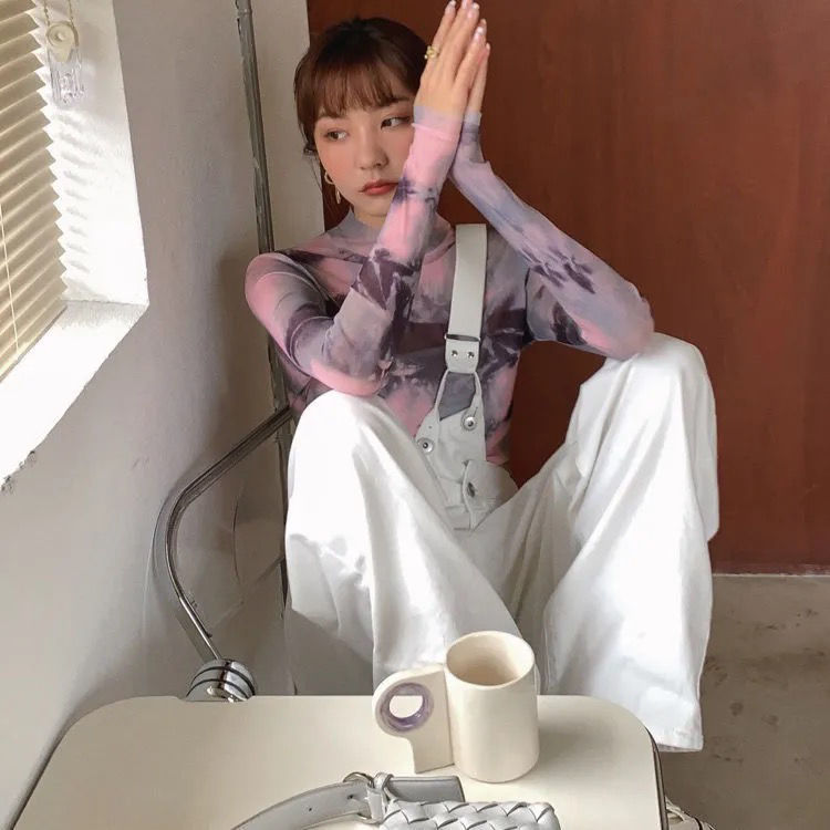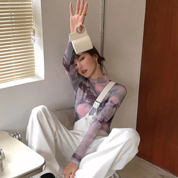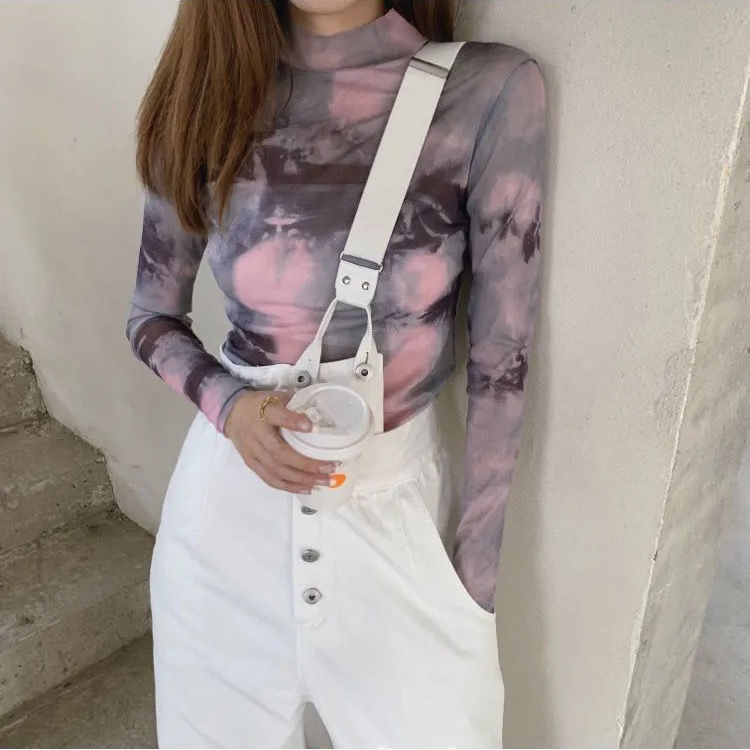 2023 Spring and Autumn New Tie-Dye Half-High Collar Base Shirt Ink Slim-Fit Outer Wear T-Shirt Korean Style Stretch Top for Women