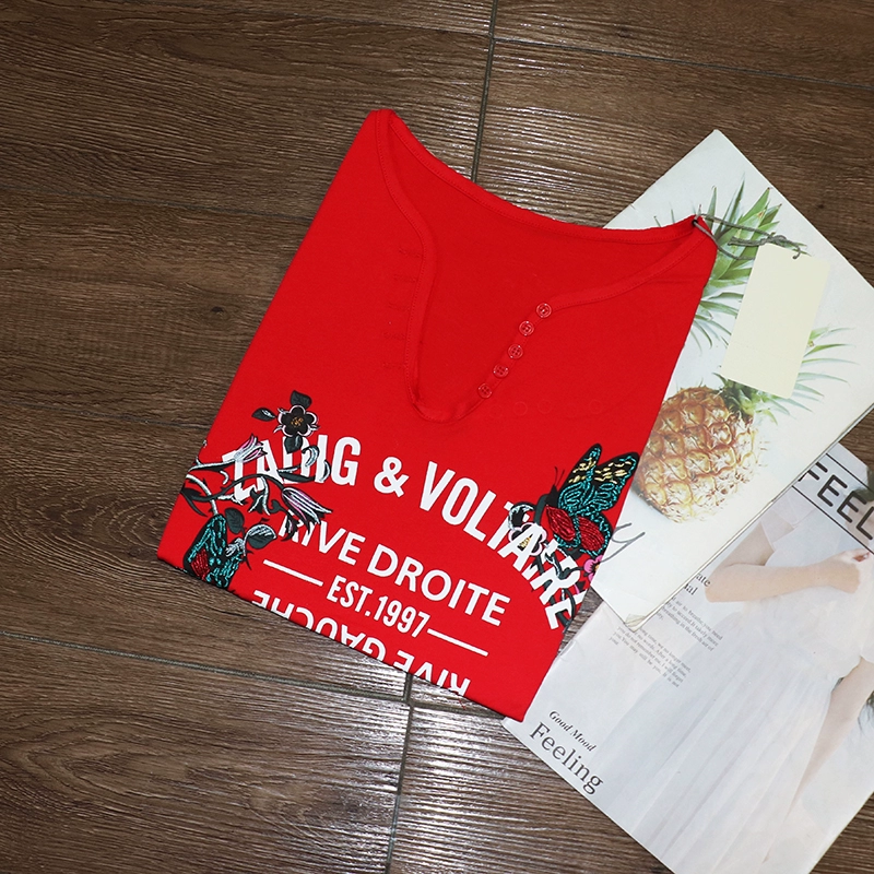 | nameOriginal | 2023 spring and summer French niche ZV classic letter print flower embroidery half open collar short-sleeved T-shirt women's thin top |