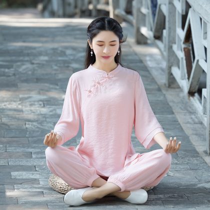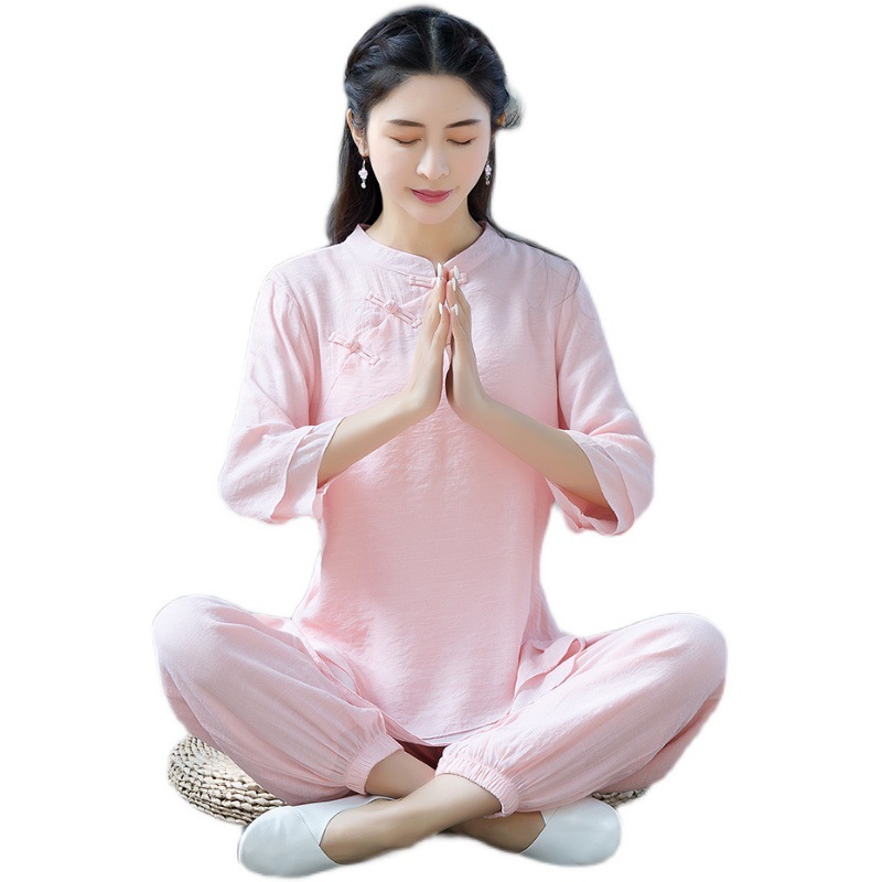 2023 spring and summer new retro ethnic style cotton and linen Zen clothing round neck half sleeve top + elastic waist trousers suit women