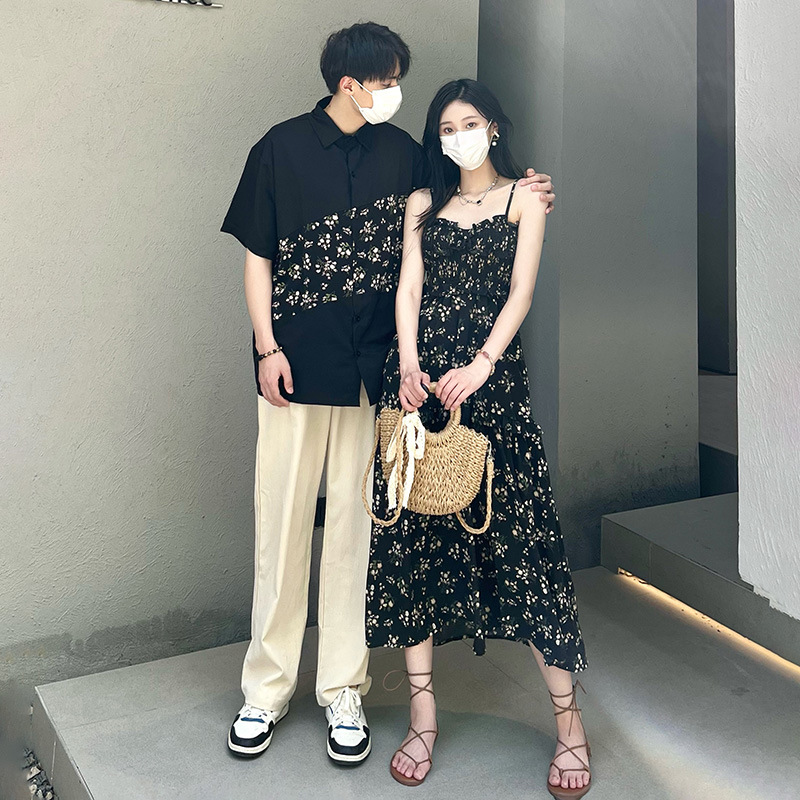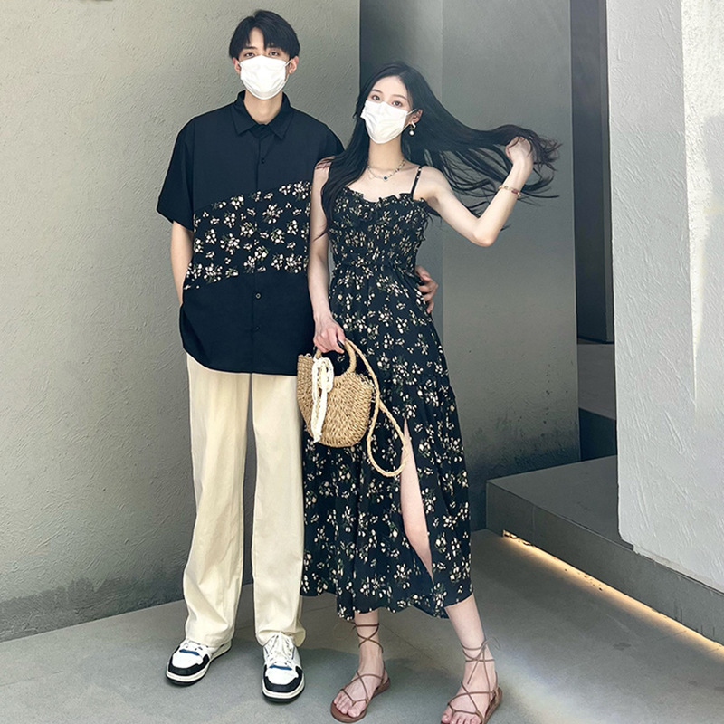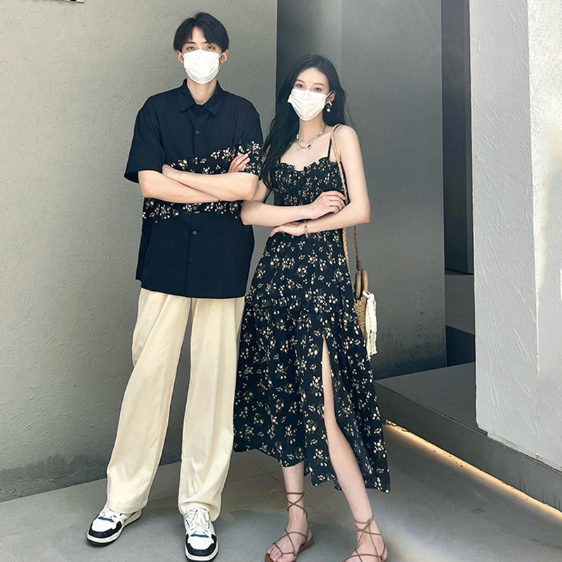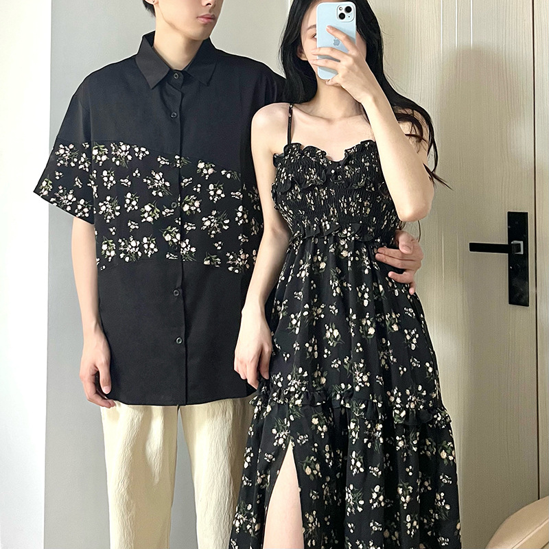 2023 Summer Couple's Long Floral Sling Dress Stitching Casual Short-sleeved Shirt Floral