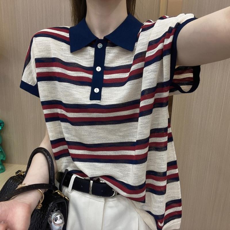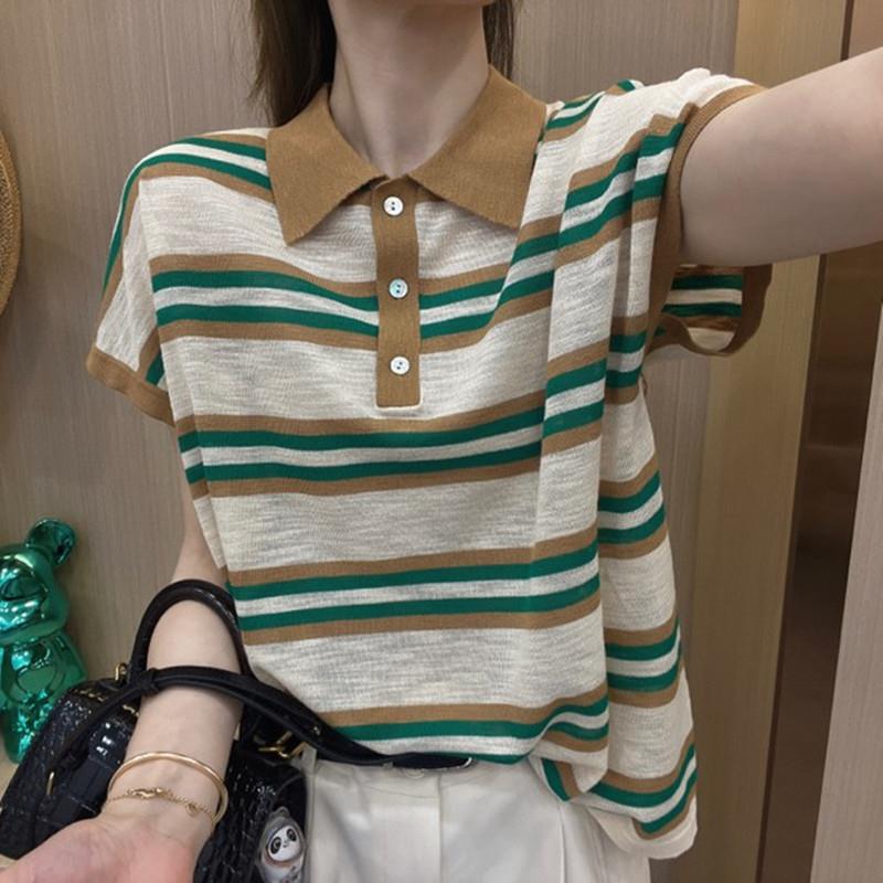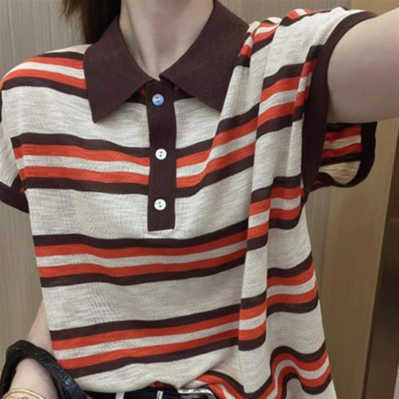 | nameOriginal | 2023 Summer Ice Silk Short-sleeved Sweater New Large Size Loose Slimming Top Striped Polo Collar T-shirt Thin |
