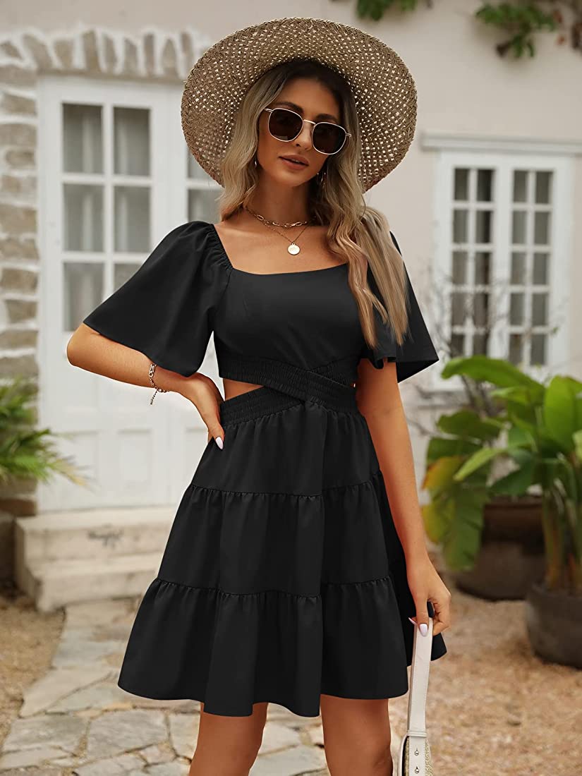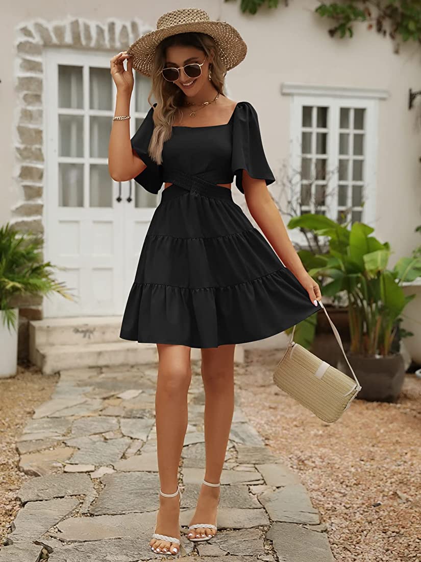 LILLUSORY Womens 2023 Summer Cutout Mini Dresses Short Sleeve Square Neck Crossover Waist Dress