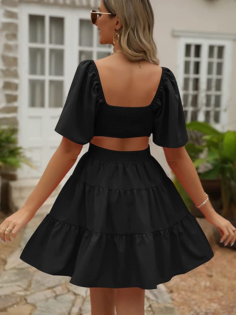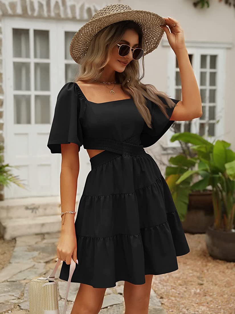2023 Summer Mini Dress for Women with Cutout Design, Short Sleeves, Square Neckline, and Crossover Waist.